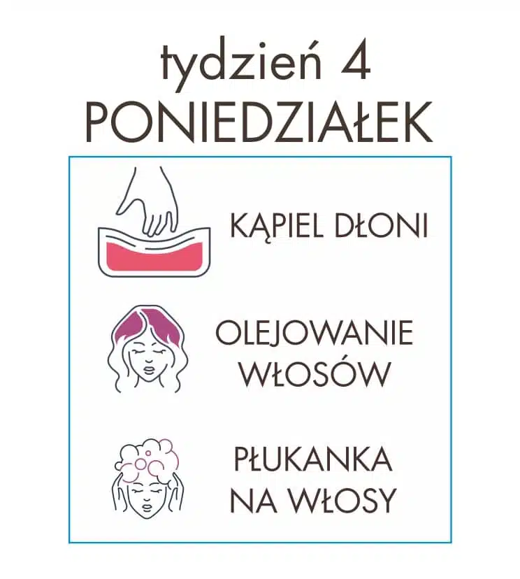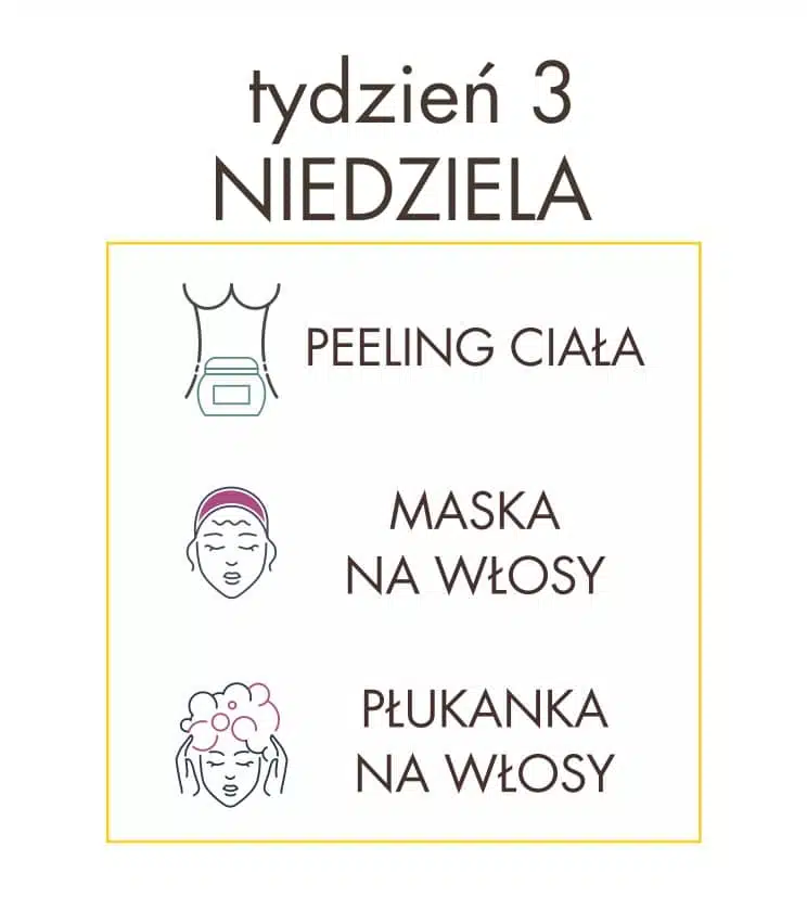 Akcja pielęgnacyjna – dzień 21 – niedziela Przygotujmy się wspólnie na nadchodzący tydzień i zadbajmy kompleksowo o ciało oraz włosy! Tym razem w podstawowej włosowej rutynie pielęgnacyjnej znajdźcie miejsce na maskę do włosów – możecie zastosować ją przed myciem głowy lub w zamian za odżywkę po umyciu. By wzmocnić jej działanie nawilżające dodaj do porcji […]