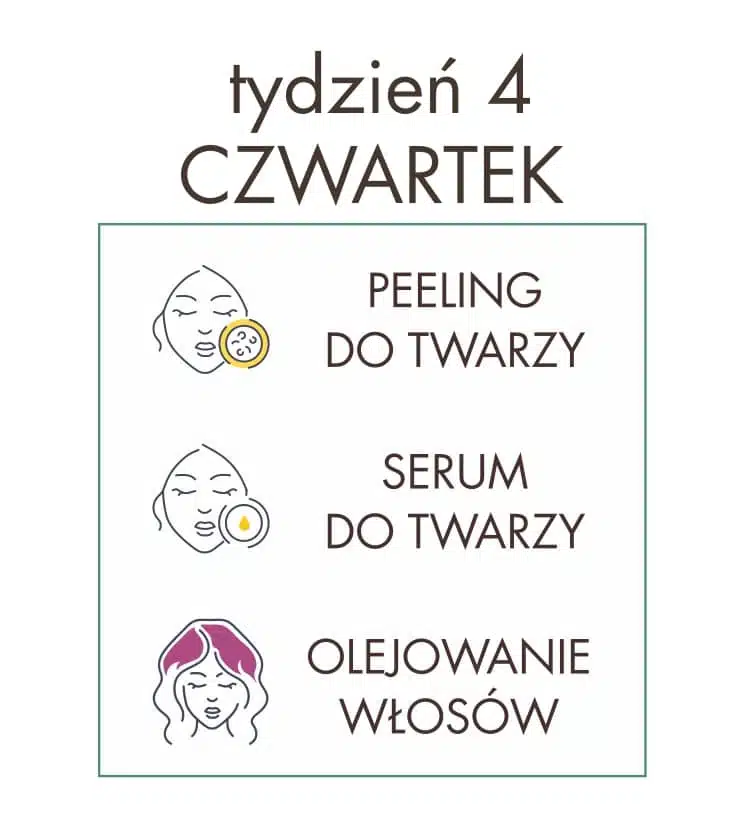 Akcja pielęgnacyjna – dzień 25 – czwartek Czwartek jako środek tygodnia jest idealnym dniem na peeling twarzy! Warto pamiętać o systematycznym złuszczaniu, ponieważ to ono wspomaga gojenie się niedoskonałości a także minimalizację widoczności rozszerzonych ujść gruczołów łojowych (tzw. porów). Ponadto systematyczne złuszczanie zapobiega zaleganiu mas rogowych dzięki czemu składniki z później aplikowanych kosmetyków mają szansę lepiej […]