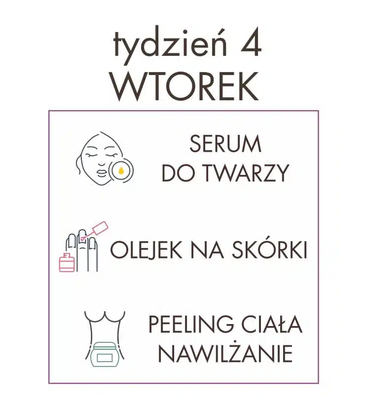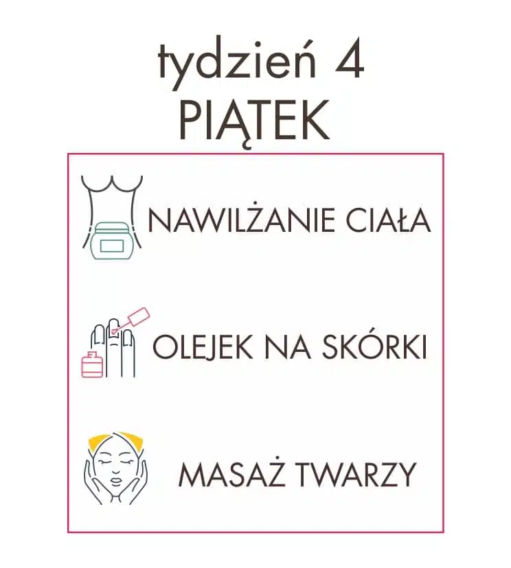 Akcja pielęgnacyjna – dzień 26 – piątek Po całym tygodniu należy pozwolić sobie na chwilę wytchnienia i odpoczynku! Dlatego dziś w ramach relaksu polecamy wykonać masaż twarzy! Do tego celu można wykorzystać ulubiony olej, olejek do demakijażu, czy tłusty krem. My jednak najbardziej polecamy olejowe serum, ponieważ zintensyfikuje działanie masażu – rozgrzana skóra jeszcze lepiej będzie oddziaływać na aplikowane […]