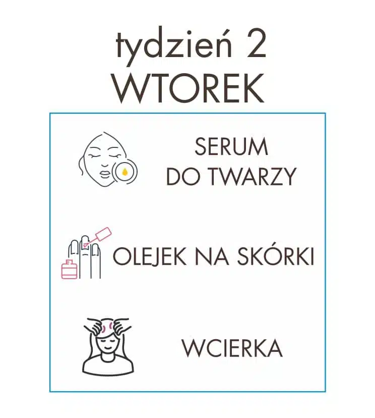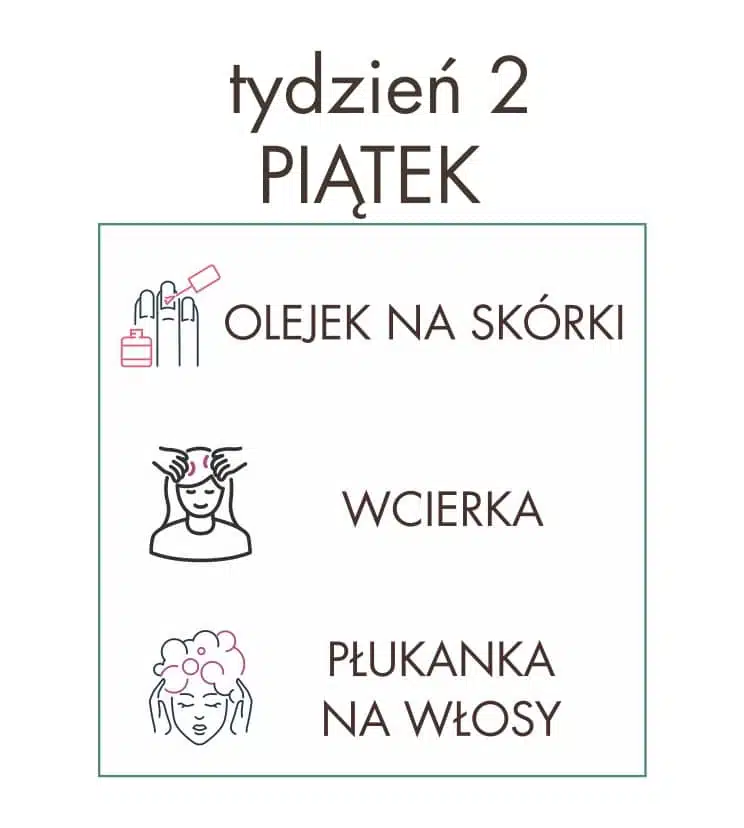Akcja pielęgnacyjna – dzień 12 – piątek Podstawą pielęgnacji włosów jest mycie szamponem, stosowanie odżywki, wcierki oraz serum zabezpieczającego końcówki. Urozmaicanie pielęgnacji stosuje się w celu dostarczenia zróżnicowanych substancji aktywnych:– 1 – 2 x w tygodniu maska w zamian za odżywkę.– Olejowanie włosów (co 2-3 mycie, można nałożyć humektantowy podkład nawilżający*).– 1 – 2 x […]