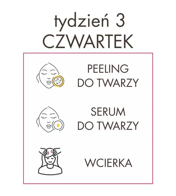 Akcja pielęgnacyjna – dzień 18 – czwartek W dzisiejszym dniu Wyzwania Pielęgnacyjnego zadbamy o twarz oraz włosy! W tym celu polecamy wykonać dogłębny peeling twarzy, by usprawnić wnikanie substancji aktywnych w głąb skóry. Peeling należy wykonać po dokładnym demakijażu i oczyszczeniu cery a po jego zakończeniu stonizować skórę. Tak przygotowana cera jest gotowa na przyjęcie wysokiej dawki substancji czynnych! Do wykonania peelingu możecie zastosować gotowe kosmetyki lub […]