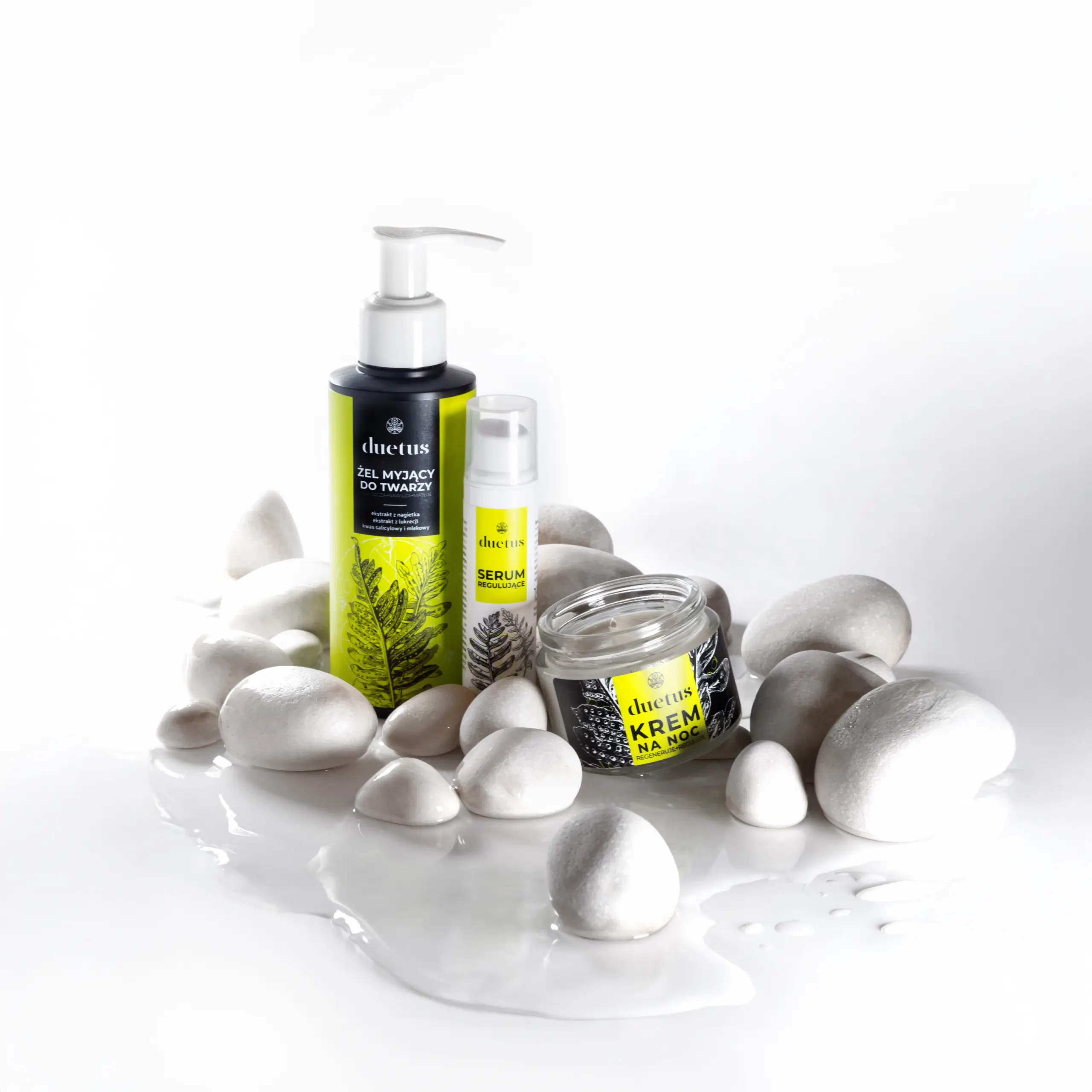 DUETUS to naturalna marka kosmetyków dla cery mieszanej, tłustej i trądzikowej, łącząca skuteczne oczyszczanie z delikatnością roślinnych formuł. Składniki regulujące i detoksykujące pomagają normalizować sebum, wspierać regenerację i przywracać skórze równowagę oraz zdrowy, matowy wygląd.