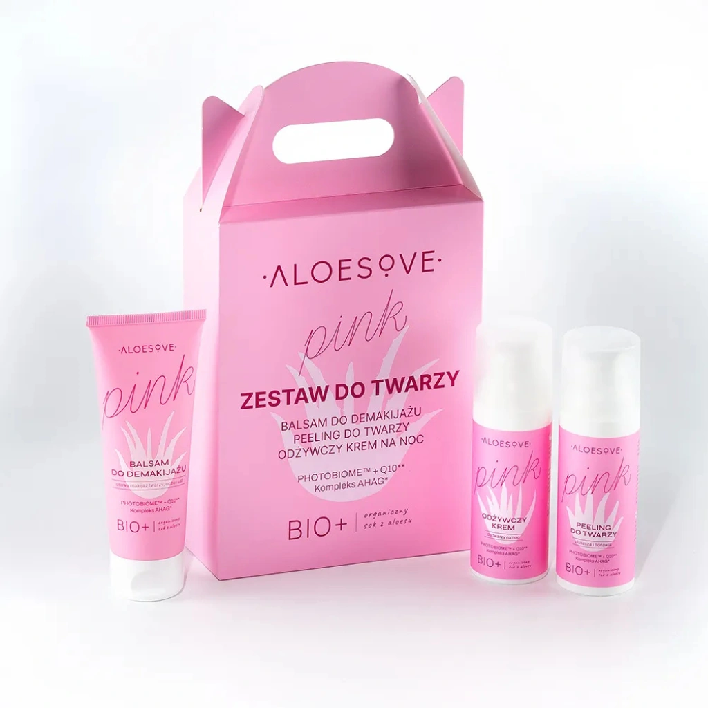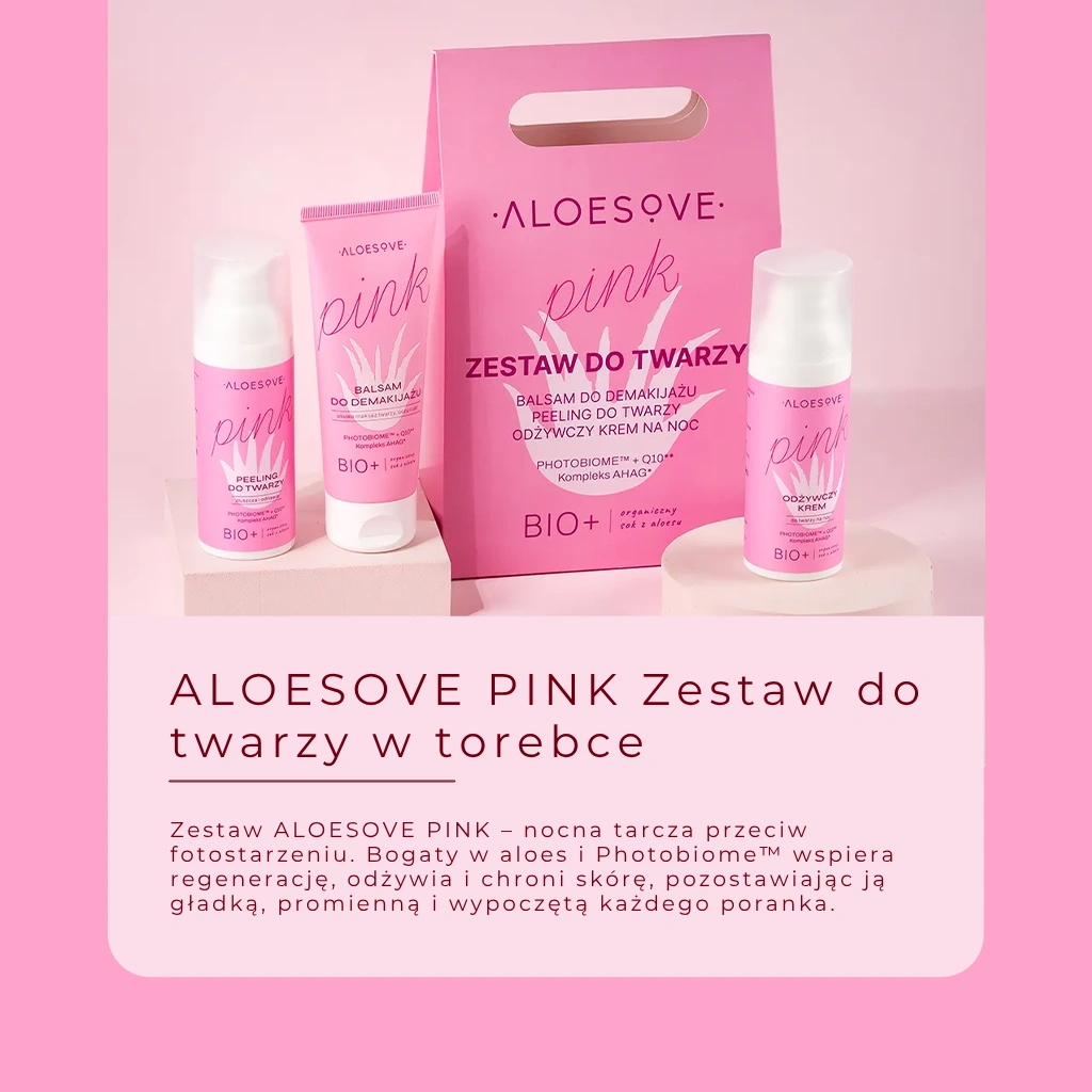Zestaw ALOESOVE PINK do twarzy to wyjątkowy zestaw kosmetyków stworzony z myślą o ochronie skóry przed fotostarzeniem. Dzięki organicznemu ekstraktowi z aloesu oraz innowacyjnemu składnikowi Photobiome™, produkty te dostarczają skórze bogatą dawkę antyoksydantów oraz składników ochronnych, które przeciwdziałają przedwczesnemu starzeniu się skóry.
