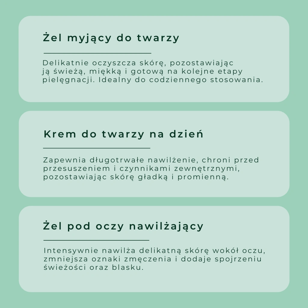 Zestaw kosmetyków do pielęgnacji każdego typu cery, zapewniający codzienną dawkę nawilżenia i ukojenia. Zawiera żel myjący, nawilżający krem na dzień i żel pod oczy, które kompleksowo zadbają o Twoją codzienną pielęgnację. Świetny jako prezent lub sposób na rozpoczęcie przygody z naturalnymi kosmetykami!