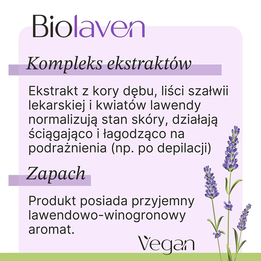 | Skład INCI | Allantoin, Aqua, Benzyl Alcohol, Beta-Caryophyllene, Camphor, Citrus Aurantium Bergamia Peel Oil, Dehydroacetic Acid, Geraniol, Glycerin, Glyceryl Stearate Citrate, Hydroxyethylcellulose, Lavandula Extract, Lavandula Oil, Limonene, Linalool, Linalyl Acetate, Oryza Sativa Starch, Panthenol, Parfum, Pinene, Propanediol, Quercus Robur Bark Extract, Salvia Officinalis Leaf Extract, Squalane, Terpineol, Tocopheryl Acetate, Triethyl Citrate, Vitis Viniferaa Seed Oil, Xanthan Gum, Zinc Ricinoleate |
