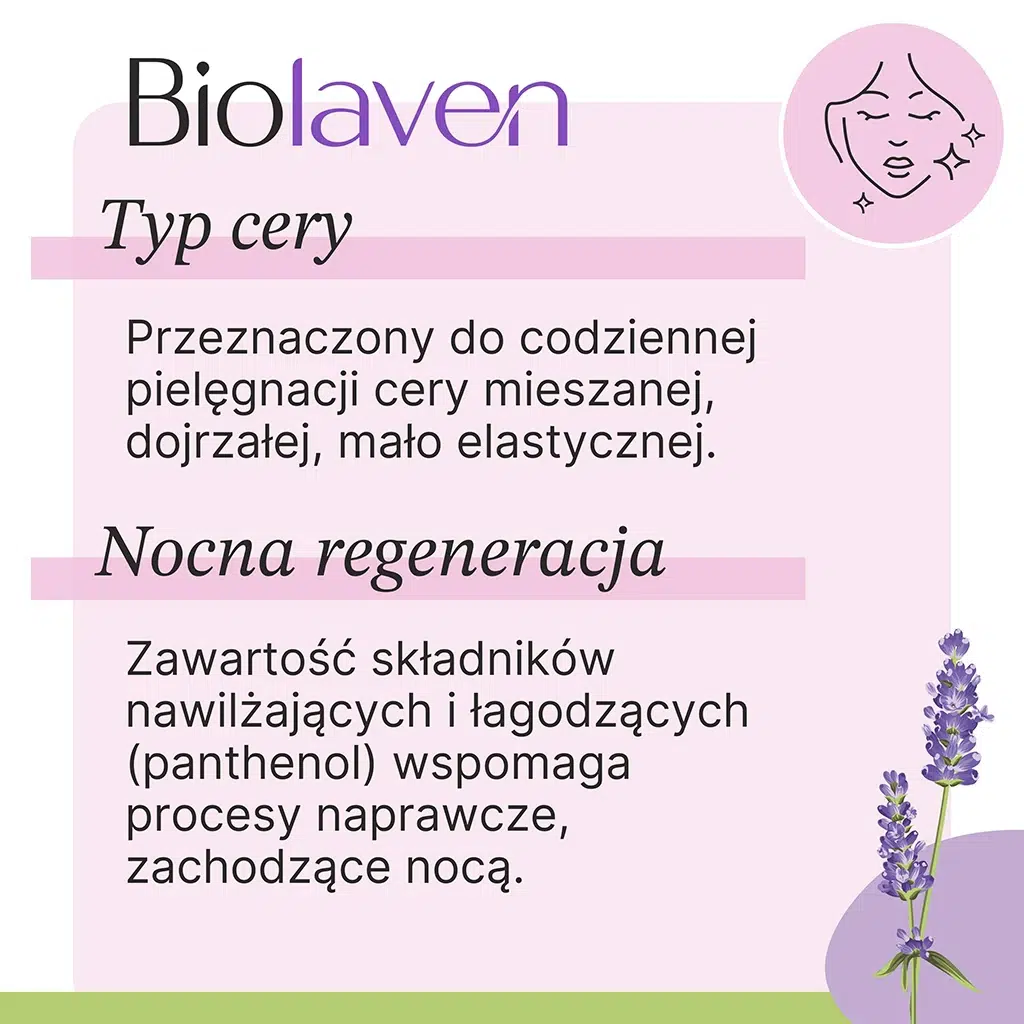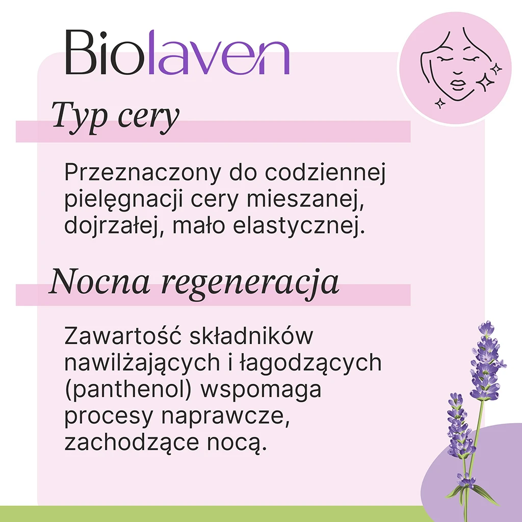 Podczas snu skóra przechodzi intensywny proces odnowy i regeneracji. Naturalny krem do twarzy BIOLAVEN wspiera skórę w tym procesie, dostarczając jej odpowiednich składników odżywczych. Krem został stworzony z myślą o pielęgnacji każdego typu cery, szczególnie mieszanej, dojrzałej i mało elastycznej.