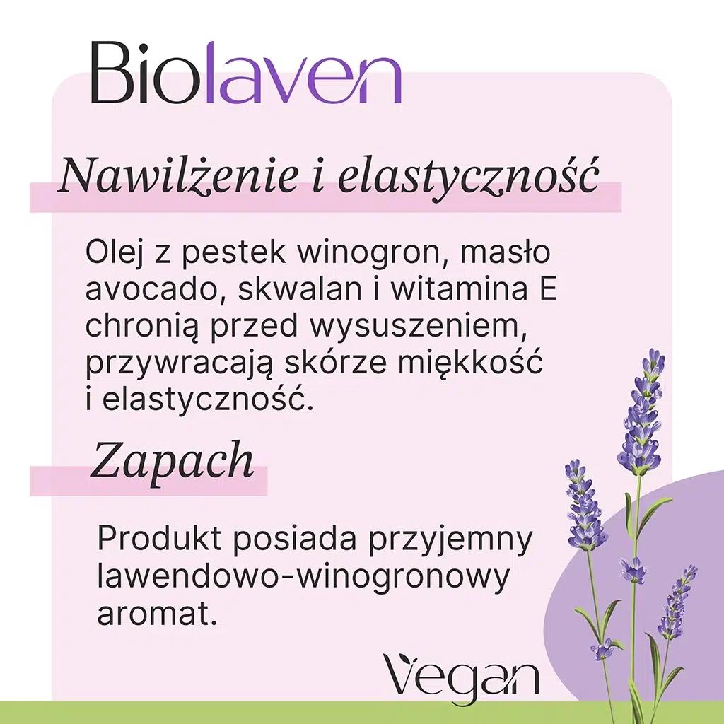 Skład INCI | Aqua, Benzyl Alcohol, Cetearyl Alcohol, Dehydroacetic Acid, Glyceryl Stearate, Glycine Soja Oil, Lavandula Angustifolia Oil, Linalool, Palmitic Acid, Panthenol, Parfum, Persea Gratissima Butter, Sorbitan Stearate, Squalane, Stearic Acid, Sucrose Cocoate, Tocopheryl Acetate, Urea, Vitis Vinifera Seed Oil, Xanthan Gum |