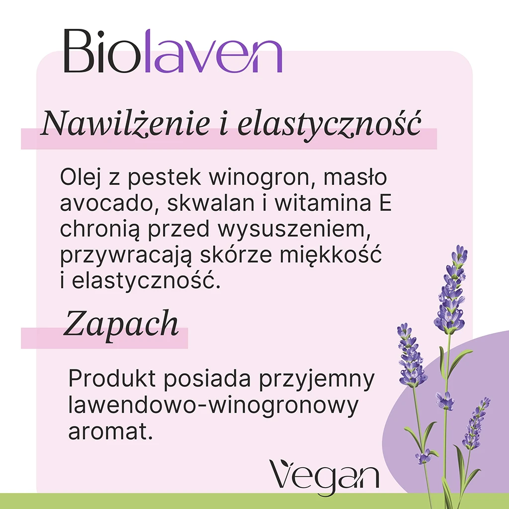 | Skład INCI | Aqua, Benzyl Alcohol, Cetearyl Alcohol, Dehydroacetic Acid, Glyceryl Stearate, Glycine Soja Oil, Lavandula Angustifolia Oil, Linalool, Palmitic Acid, Panthenol, Parfum, Persea Gratissima Butter, Sorbitan Stearate, Squalane, Stearic Acid, Sucrose Cocoate, Tocopheryl Acetate, Urea, Vitis Vinifera Seed Oil, Xanthan Gum |