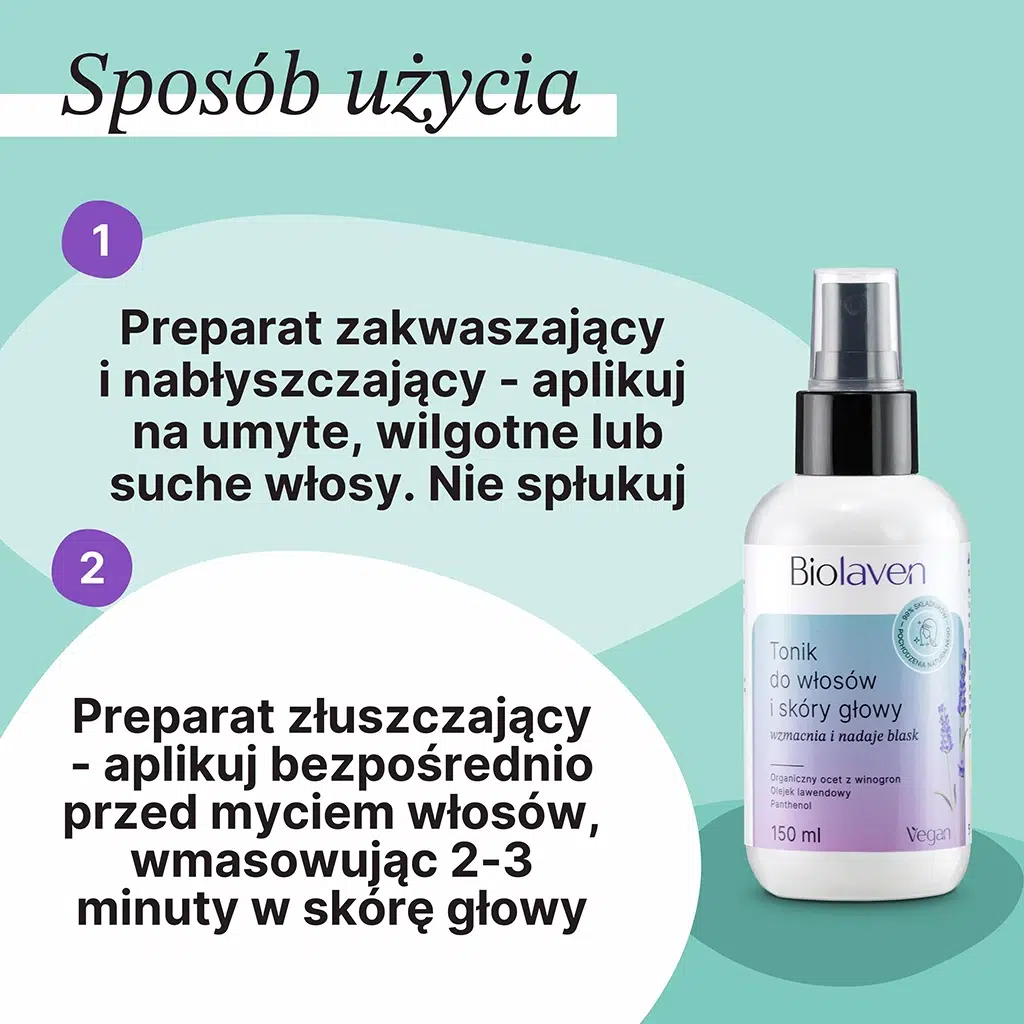 Twoje włosy i skóra głowy potrzebują wyjątkowej pielęgnacji, dlatego stworzyliśmy nasz Tonik BIOLAVEN. Przeznaczony do pielęgnacji włosów suchych, matowych, pozbawionych blasku, oraz do oczyszczania skóry głowy.