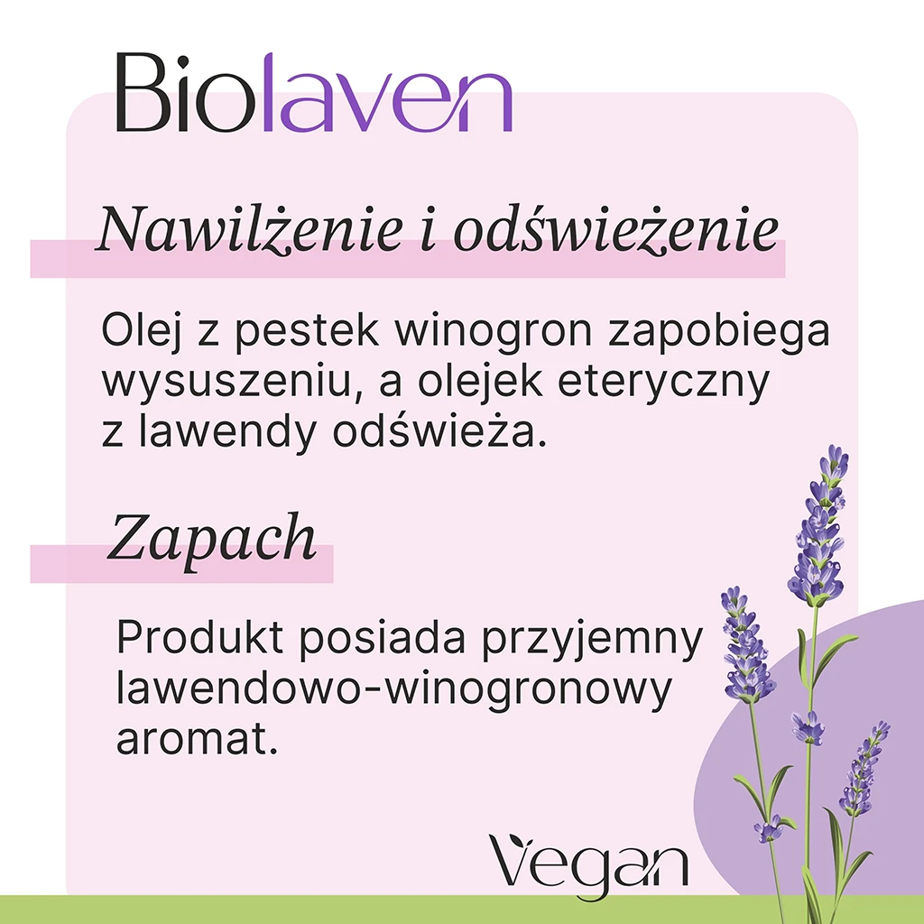 Składniki wiodące: Kwas mlekowy, Olej z pestek winogron, Olejek eteryczny z lawendy