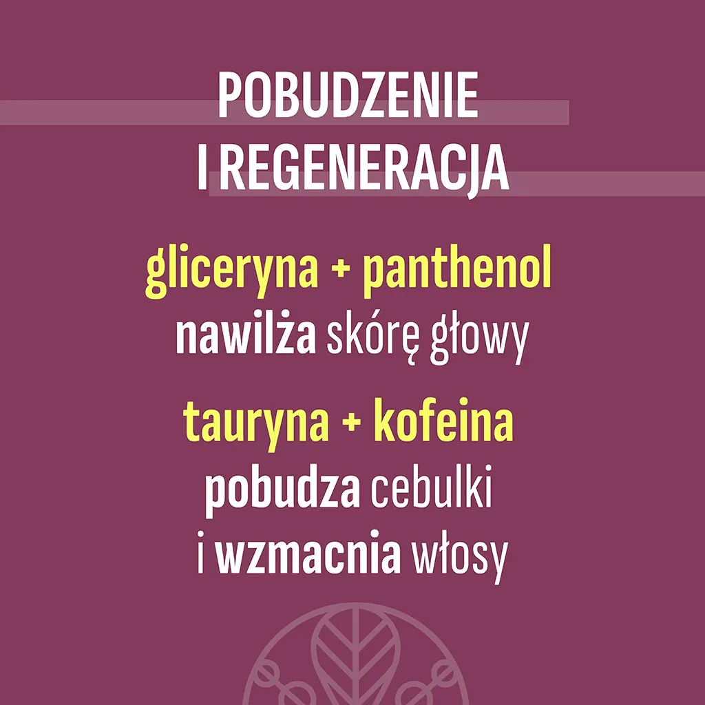 • Tauryna – działa energetyzująco, poprawiając mikrokrążenie skóry głowy i zapobiegając wypadaniu włosów.