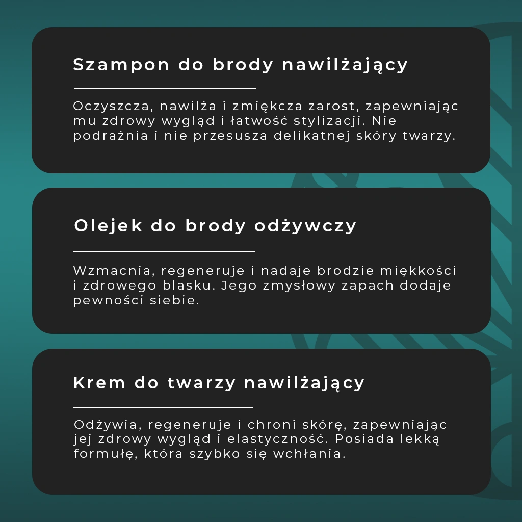 Zestaw Duetus to także świetny pomysł na prezent dla każdego mężczyzny dbającego o swój wygląd. Elegancko dobrane produkty – krem do twarzy, szampon do brody i olejek – tworzą kompletną rutynę pielęgnacyjną, która pozwala na codzienną troskę o skórę i włosy. To praktyczny, stylowy i funkcjonalny prezent, który ucieszy każdego brodacza, niezależnie od długości i typu brody, łącząc troskę o wygląd z przyjemnością codziennego rytuału.