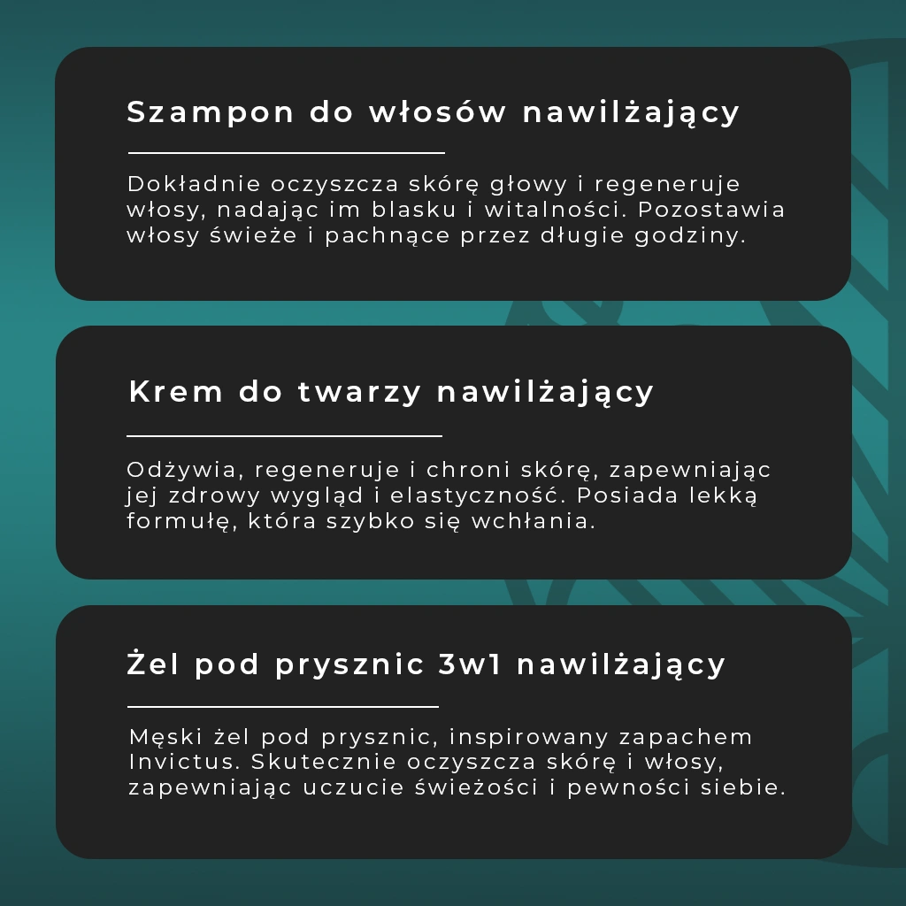 Zestaw Power of Invictus to wszystko, czego potrzebuje mężczyzna, aby zadbać o włosy, twarz i ciało w codziennej pielęgnacji. Szampon nawilżający oczyszcza włosy i skórę głowy, krem do twarzy chroni i nawilża skórę, a żel 3w1 odświeża i pielęgnuje ciało. Produkty zostały opracowane tak, aby tworzyć spójną rutynę pielęgnacyjną, zapewniając komfort, świeżość i zdrowy wygląd każdego dnia.