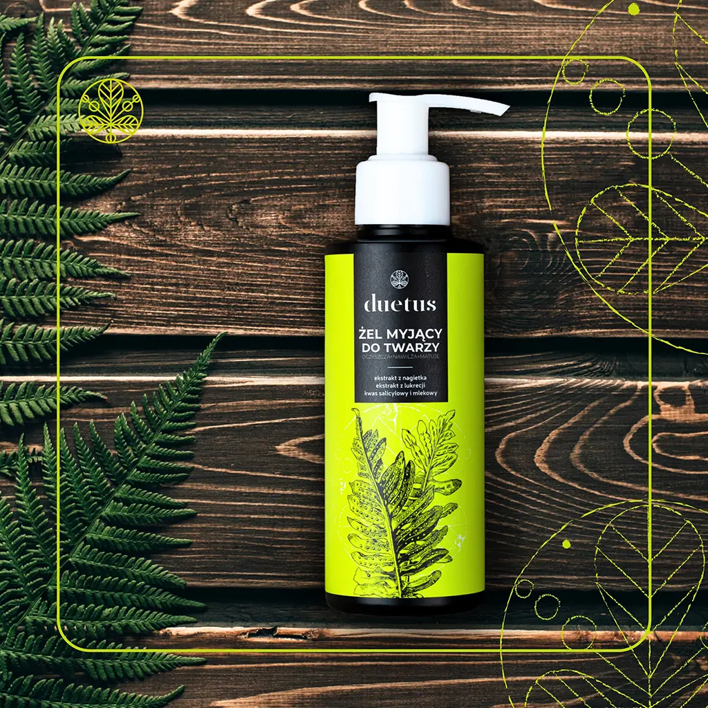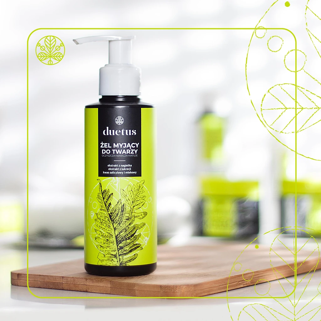 DUETUS Żel myjący do twarzy został specjalnie stworzony z myślą o cerze mieszanej, tłustej, trądzikowej, zanieczyszczonej oraz wrażliwej. Żel efektywnie usuwa zanieczyszczenia, nadmiar sebum i pozostałości makijażu. Pozostawia skórę wyraźnie oczyszczoną, świeżą i gładką w dotyku.
