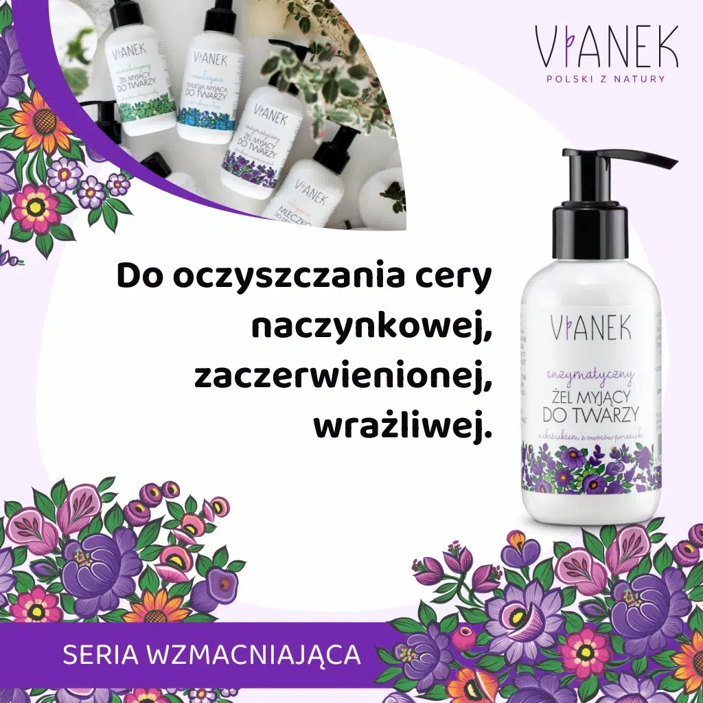 Delikatny żel enzymatyczny do oczyszczania cery naczynkowej, zaczerwienionej i wrażliwej. Dokładnie usuwa resztki makijażu, nadmiar sebum i inne zanieczyszczenia twarzy. Dodatkowo delikatnie złuszcza martwy naskórek, redukuje zaczerwienienia.