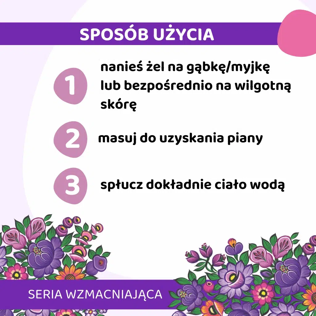 | Sposób użycia | Nanieś żel na gąbkę/myjkę lub bezpośrednio na wilgotną skórę i masuj do uzyskania piany. Następnie spłucz dokładnie ciało wodą. |