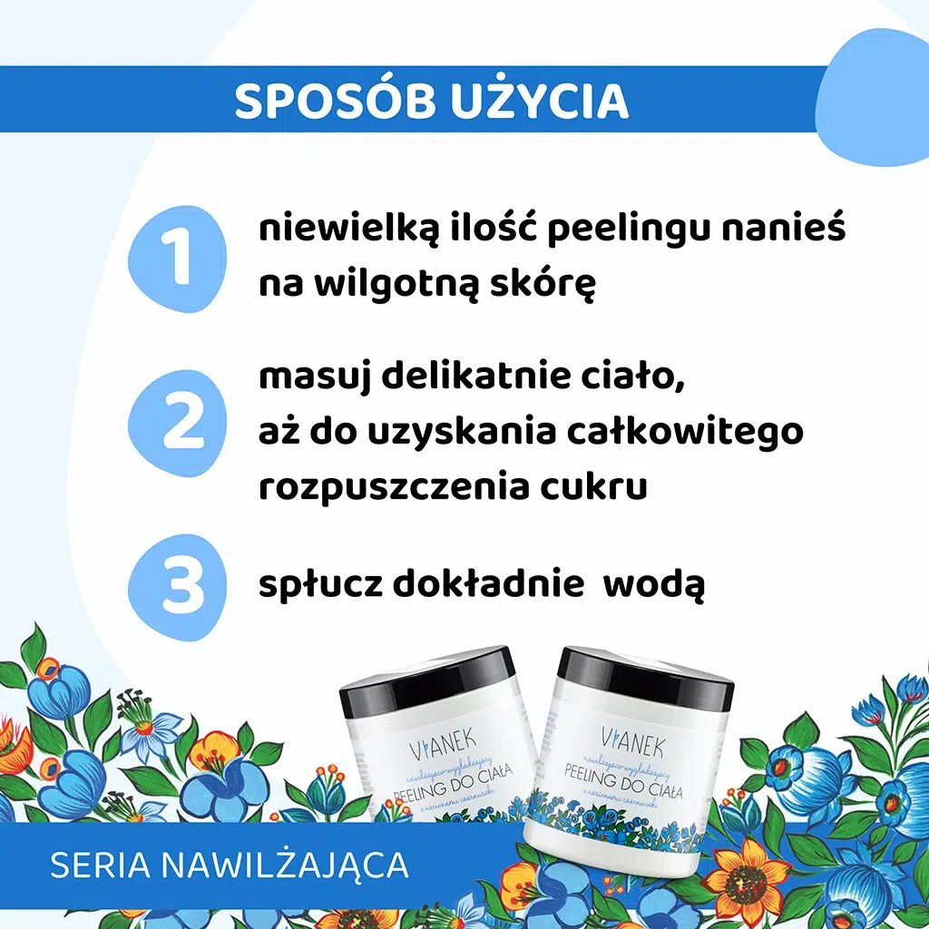 | Sposób użycia | Niewielką ilość peelingu nanieś na wilgotną skórę i delikatnie masuj ciało, aż do całkowitego rozpuszczenia cukru. Następnie spłucz wodą. Stosuj 1-2 razy w tygodniu. |