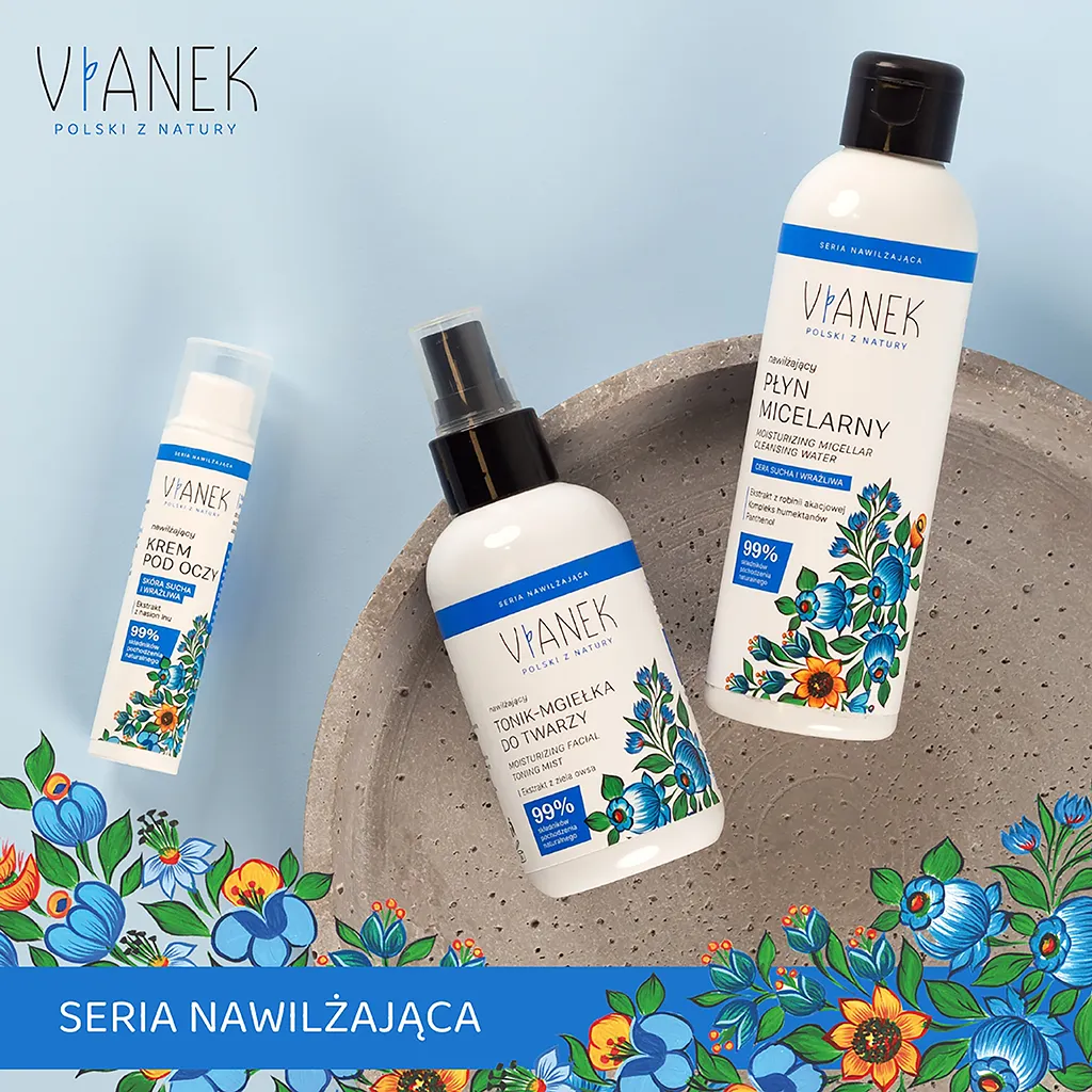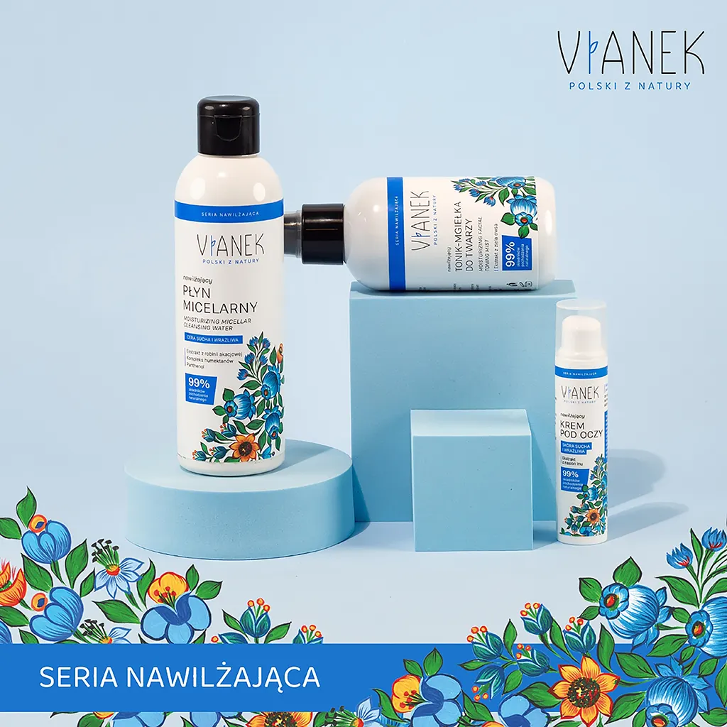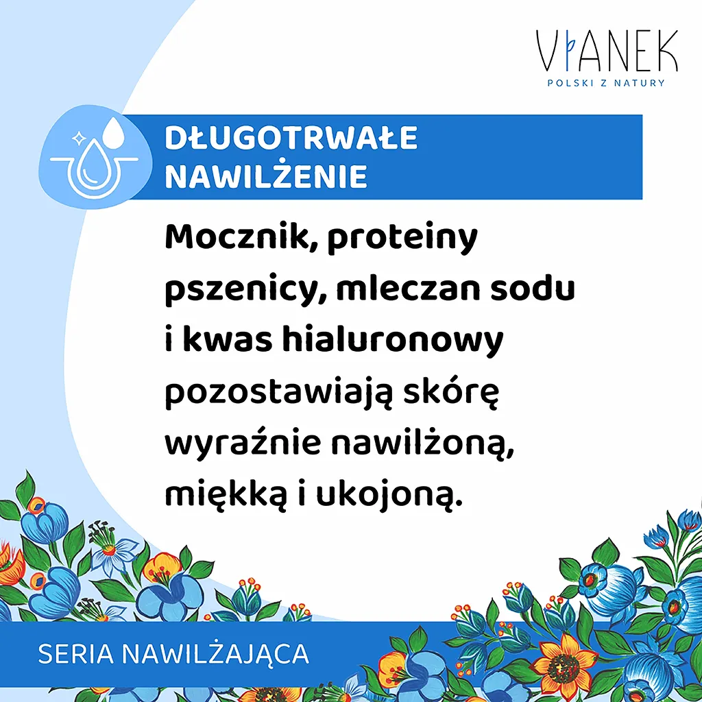 Produkt charakteryzuje się długotrwałym działaniem nawilżającym. W swoim składzie ma mocznik, proteiny pszenicy, mleczan sodu i kwas hialuronowy, które zapewniają wyraźne nawilżenie. Pozostawiają skórę miękką i ukojoną. Płyn micelarny VIANEK jest doskonałym wyborem dla osób z suchą i wrażliwą skórą.