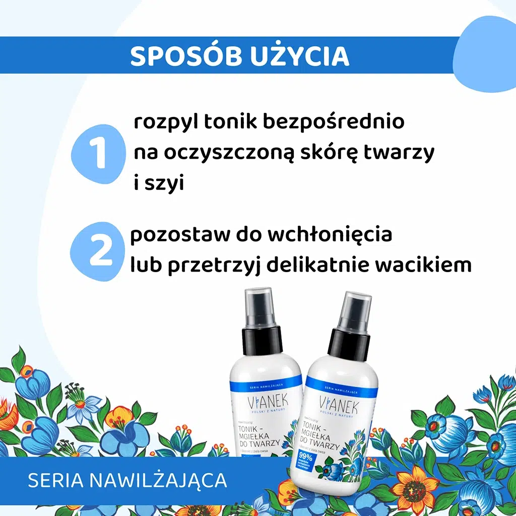 | Sposób użycia | Rozpyl tonik bezpośrednio na oczyszczoną skórę twarzy i szyi i pozostaw do wchłonięcia lub przetrzyj delikatnie wacikiem. Można stosować klasycznie, rozpylając tonik na wacik. |