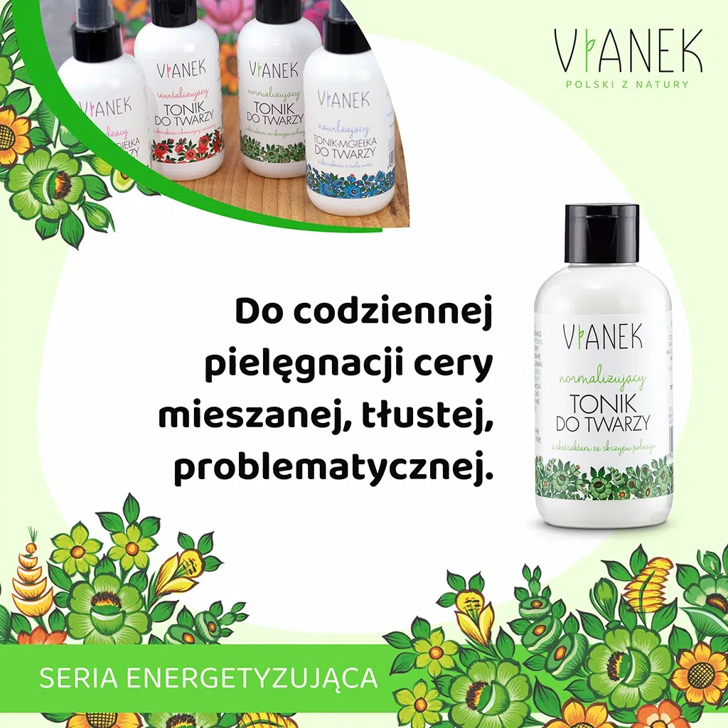 Normalizujący tonik do twarzy VIANEK to codzienna dawka odświeżenia i pielęgnacji, skierowana przede wszystkim do cery mieszanej, tłustej i problematycznej. Posiada niskie pH (3.0). Przywraca skórze po oczyszczaniu odpowiednią równowagę i przygotowuje ją na dalsze etapy pielęgnacji, ułatwiając przenikanie składników zawartych w kosmetykach w głąb skóry.