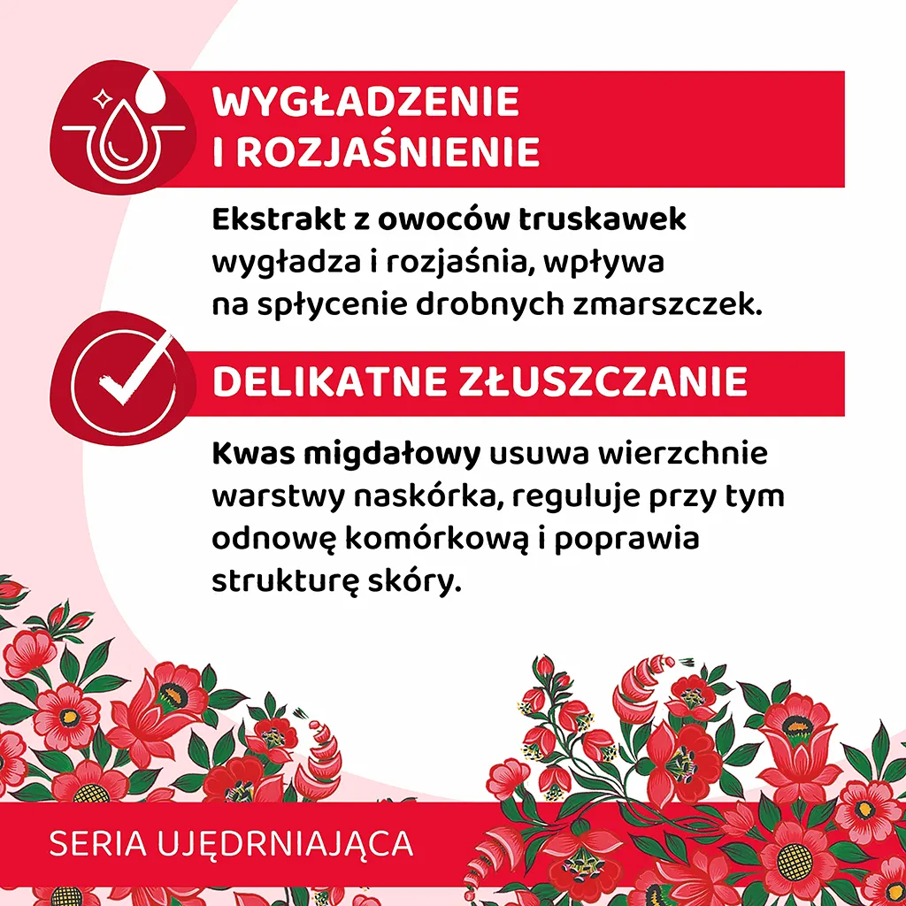 | Składniki wiodące | Ekstrakt z truskawek, Kwas migdałowy, Panthenol |