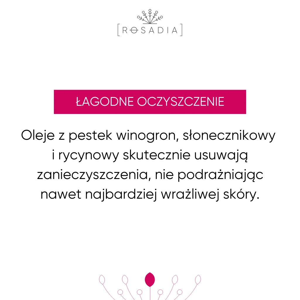 Delikatne mleczko przeznaczone do usuwania makijażu z twarzy, okolic oczu i ust. Skutecznie usuwa zanieczyszczenia, nie podrażniając przy tym skóry. Zawiera kombinację olejów: słonecznikowego, z pestek winogron i oleju rycynowego. Olej z pestek dzikiej róży to źródło naturalnych antyoksydantów, spowalniających procesy starzenia i zwiększających elastyczność. Skóra po zastosowaniu mleczka pozostaje czysta i promienna, a dzięki olejkom eterycznym przyjemnie ukojona.