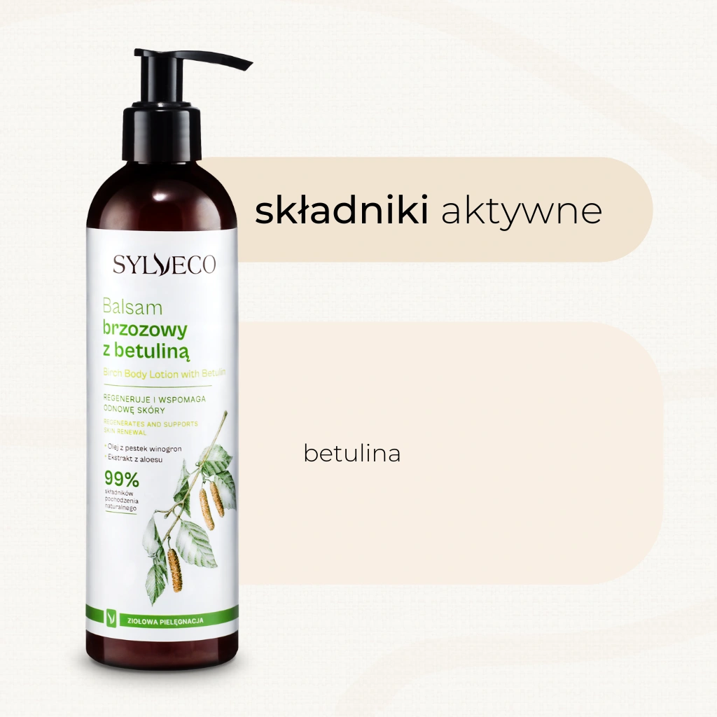 Skóra sucha, wrażliwa, szorstka i łuszcząca się wymaga długotrwałego nawilżenia i odżywienia. Olej z pestek winogron, wiodący składnik balsamu brzozowego, przywróci uczucie elastycznej, miękkiej i gładkiej skóry, a betulina zmniejszy uczucie swędzenia. Balsam brzozowy z betuliną powstał na bazie naturalnego oleju z pestek winogron, bogatego w flawonoidy i antyutleniacze, które wspomagają regenerację, a przede wszystkim znacznie opóźniają efekty starzenia się skóry. Balsam nie zawiera kompozycji zapachowych – jest naturalny, nadaje się do każdego rodzaju skóry, szczególnie wrażliwej i nadreaktywnej. Główne substancje aktywne – betulina i kwas betulinowy, uzyskiwane z kory brzozy, łagodzą wszelkie podrażnienia i pobudzają komórki do odnowy. Ekstrakt z aloesu przywraca skórze właściwy poziom nawilżenia, natomiast dodatek witaminy E zabezpiecza ją przed negatywnym wpływem środowiska.