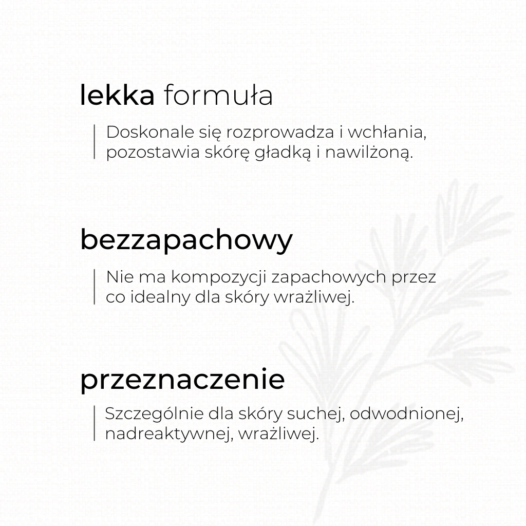 | Typ skóry | Skóra nadreaktywna, Skóra odwodniona, Skóra sucha, Skóra wrażliwa |