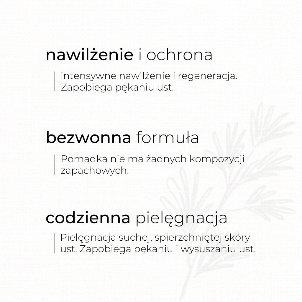 W naszej pomadce nie ma miejsca na zbędne kompozycje zapachowe, które mogą powodować podrażnienia. Produkt jest bezwonny, dlatego idealnie nadaje się dla wszystkich, którzy preferują naturalne rozwiązania.