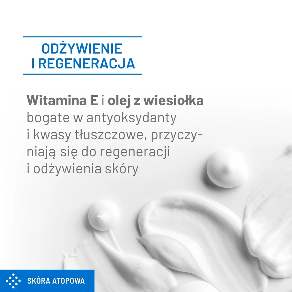 Oleje roślinne ze słonecznika i słodkich migdałów oraz betulina wzmacniają barierę ochronną skóry, przywracając jej elastyczność i zdrowy wygląd. Witamina E oraz olej z wiesiołka, bogate w antyoksydanty i kwasy tłuszczowe, wspierają regenerację i odżywienie skóry, przyczyniając się do jej zdrowego wyglądu.