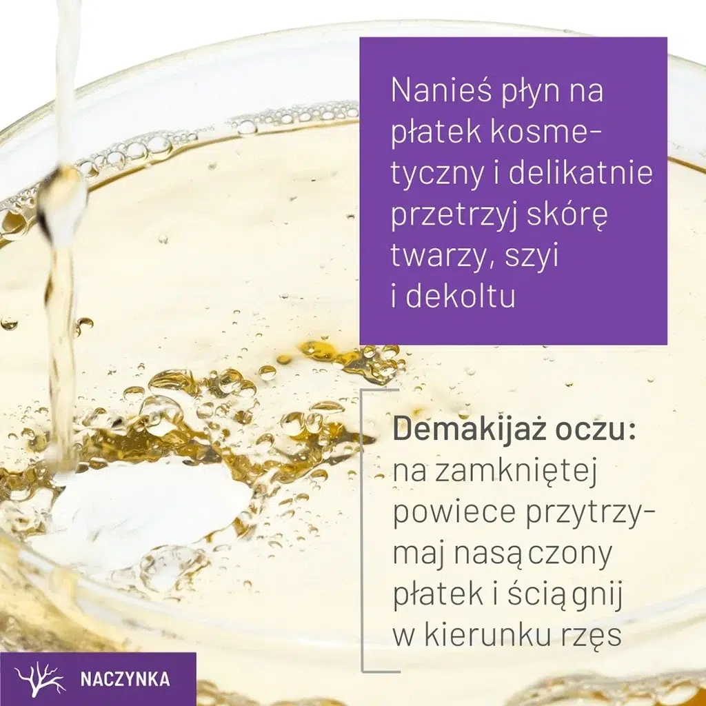Sposób użycia | Nanieś płyn na płatek kosmetyczny i delikatnie przetrzyj skórę twarzy, szyi i dekoltu. Aby usunąć makijaż oczu, na zamkniętej powiece przytrzymaj nasączony płatek i ściągnij w kierunku rzęs. |