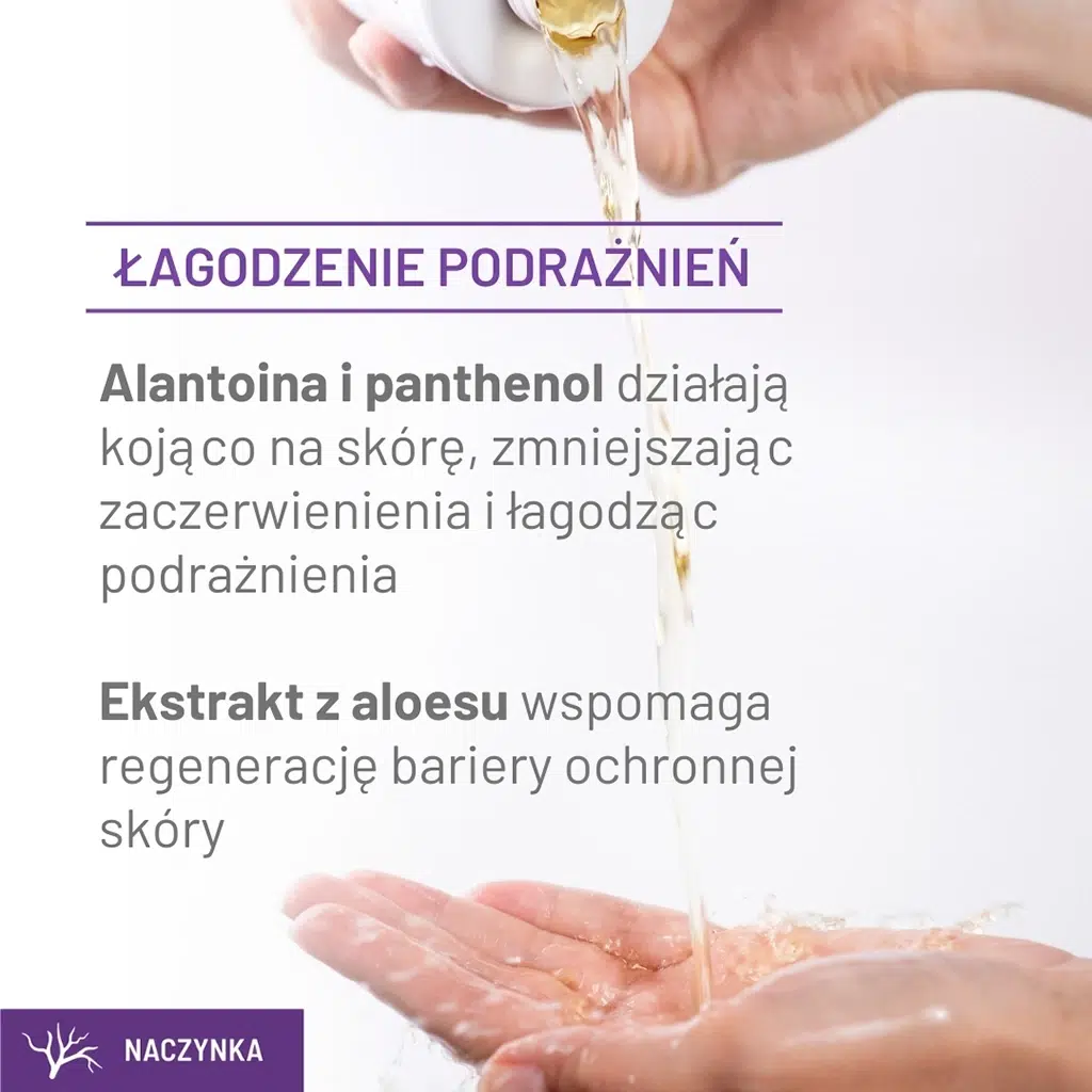 Dzięki zawartości alantoiny i panthenolu, znanych ze swoich właściwości kojących, płyn skutecznie łagodzi podrażnienia i zaczerwienienia. Dodatek ekstraktu z aloesu jest wsparciem w regeneracji bariery hydrolipidowej. Dzięki temu skóra pozostaje w świetnej kondycji, odporna na szkodliwe czynniki zewnętrzne.