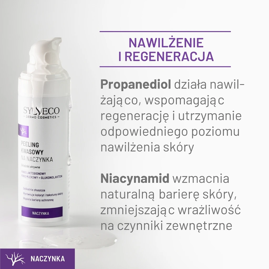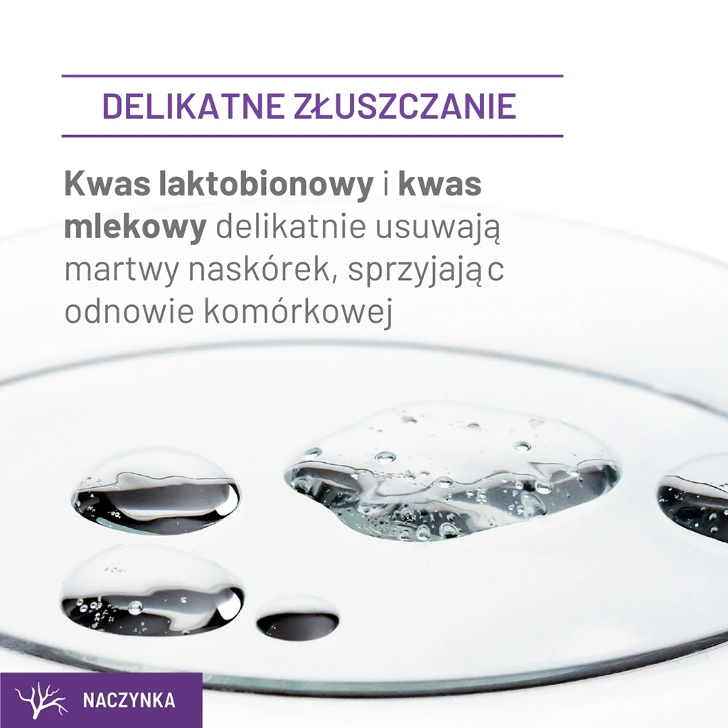 Dzięki kwasowi laktobionowemu i kwasowi mlekowemu, peeling skutecznie, ale delikatnie usuwa martwy naskórek, wspierając naturalną odnowę komórkową. Taka metoda złuszczania naskórka minimalizuje ryzyko powstawania podrażnień i uszkodzeń mechanicznych skóry.