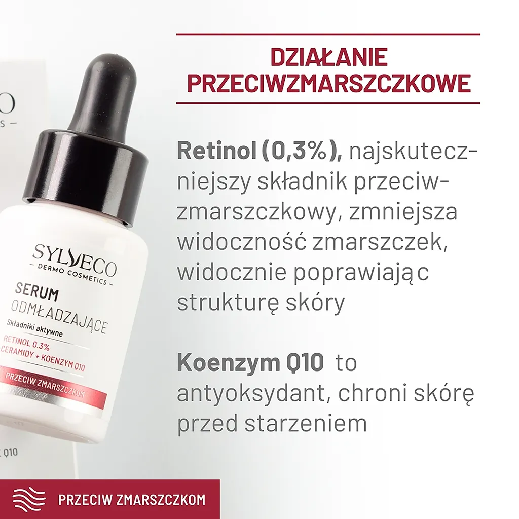 Odmładzające serum do twarzy powstało z myślą o osobach walczących z widocznymi efektami starzenia, ze zmarszczkami mimicznymi, utratą jędrności i gęstości skóry. Dzięki zastosowaniu najskuteczniejszego składnika przeciwzmarszczkowego, retinolu (0,3%), serum zmniejsza widoczność zmarszczek, widocznie poprawiając teksturę skóry.