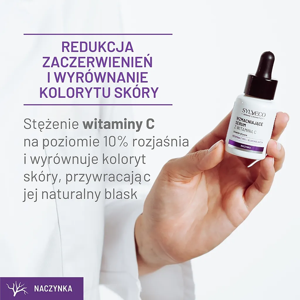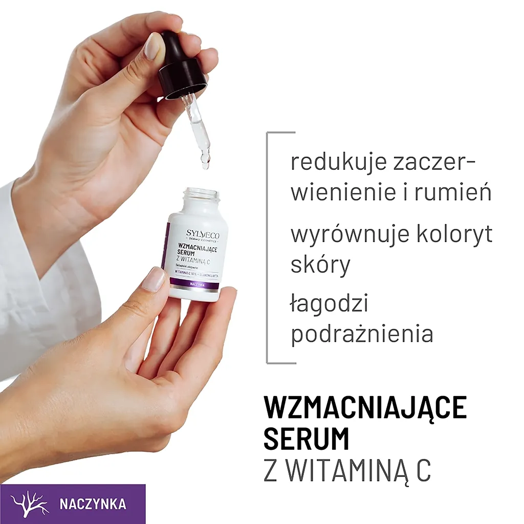 Wzmacniające serum z witaminą C zostało stworzone dla osób zmagających się z zaczerwienieniem, rumieniem, poszerzonymi naczynkami oraz trądzikiem różowatym. To produkt o mocno skoncentrowanej formule, bogatej w cenne składniki aktywne, który pomaga poprawić kondycję skóry i przywrócić jej naturalny blask.