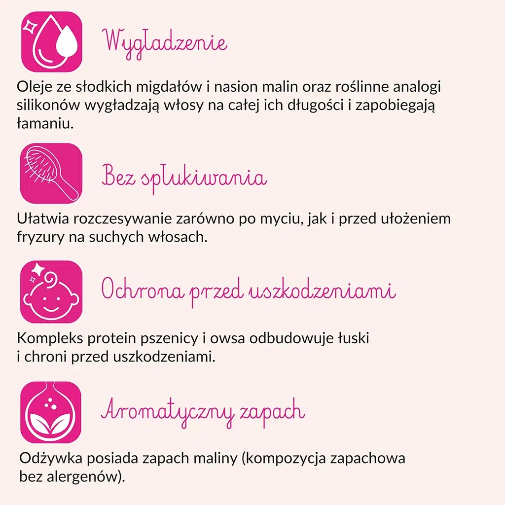 Odżywka zawiera oleje ze słodkich migdałów i nasion malin oraz roślinne analogi silikonów, które wygładzają włosy na całej ich długości i zapobiegają łamaniu. Odżywka ułatwia rozczesywanie splątanych włosów dziecka.