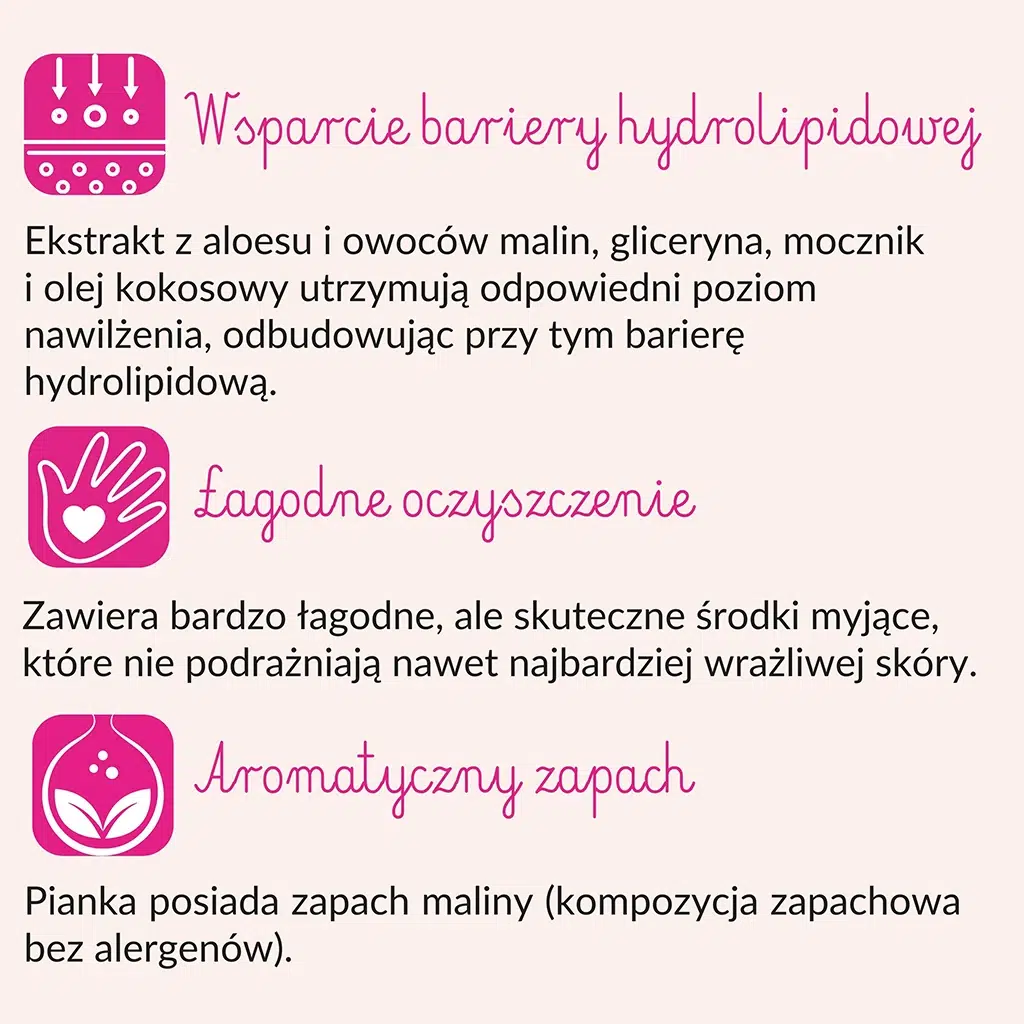 Puszysta i pachnąca malinami pianka sprawi, że mycie dziecięcych rąk stanie się przyjemną, codzienną rutyną. Delikatne środki myjące skutecznie oczyszczają, nie podrażniając nawet najbardziej wrażliwej skóry. Ekstrakty z aloesu i owoców malin, gliceryna, mocznik i olej kokosowy utrzymują odpowiedni poziom nawilżenia i odbudowują barierę hydrolipidową.