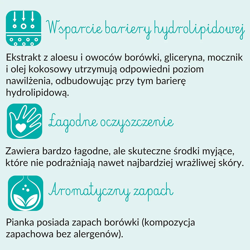 Puszysta i pachnąca borówkami pianka sprawi, że mycie dziecięcych rąk stanie się przyjemną, codzienną rutyną. Delikatne środki myjące skutecznie oczyszczają, nie podrażniając nawet najbardziej wrażliwej skóry. Ekstrakty z aloesu i owoców borówki, gliceryna, mocznik i olej kokosowy utrzymują odpowiedni poziom nawilżenia i odbudowują barierę hydrolipidową.