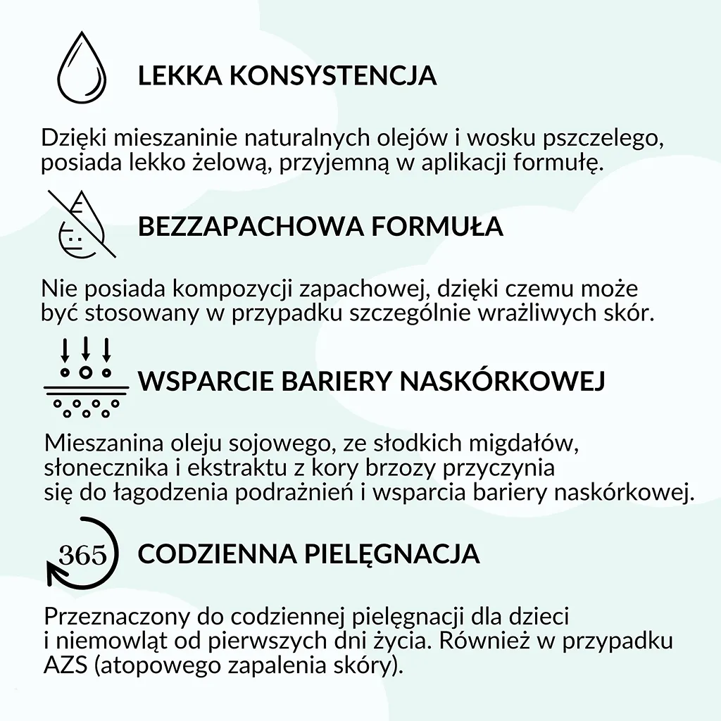 Oliwka oparta na betulinie z kory brzozy skutecznie łagodzi podrażnienia, swędzenie i zaczerwienienia, wspierając regenerację delikatnej skóry dziecka. Kompozycja naturalnych olejów, w tym oleju ze słodkich migdałów i oliwy z oliwek, intensywnie natłuszcza i zapobiega utracie wilgoci. Wosk pszczeli wzmacnia barierę ochronną skóry, chroniąc ją przed przesuszeniem. Prosty, hipoalergiczny skład sprawia, że oliwka jest odpowiednia także dla skóry wrażliwej i atopowej już od pierwszego miesiąca życia