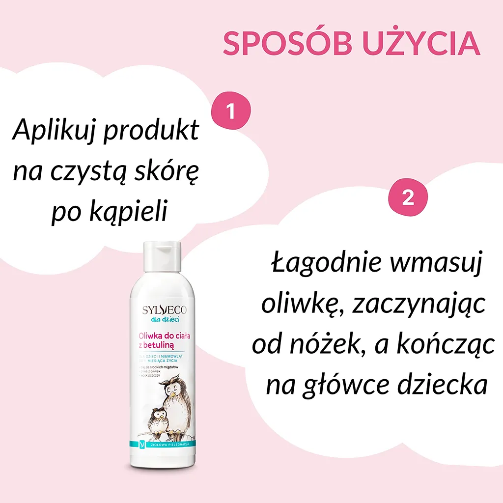 Produkt aplikować na czystą skórę po kąpieli, łagodnie wmasowując oliwkę, zaczynając od nóżek, a kończąc na główce dziecka.