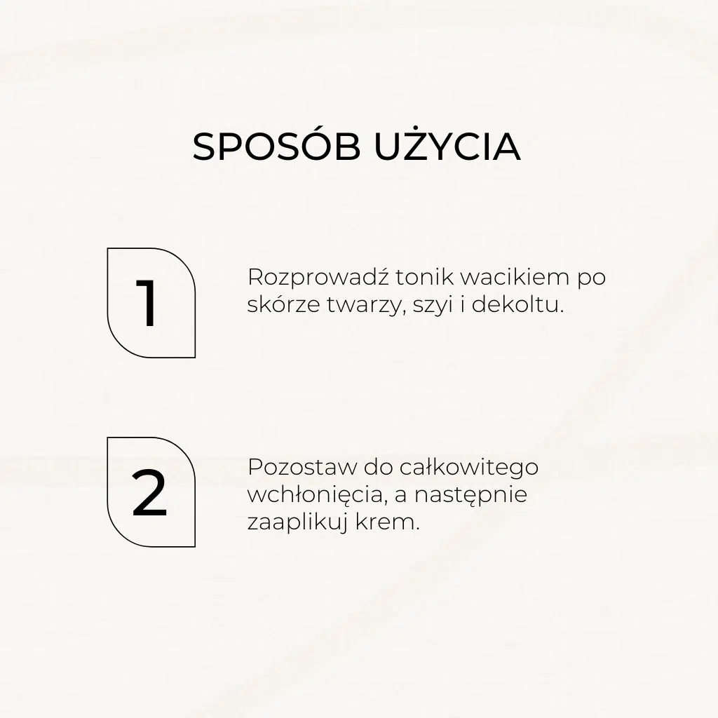 | Sposób użycia | Tonik rozprowadzić na twarzy, szyi i dekolcie za pomocą wacika. Pozostawić do całkowitego wchłonięcia, a następnie zaaplikować odpowiedni krem. |