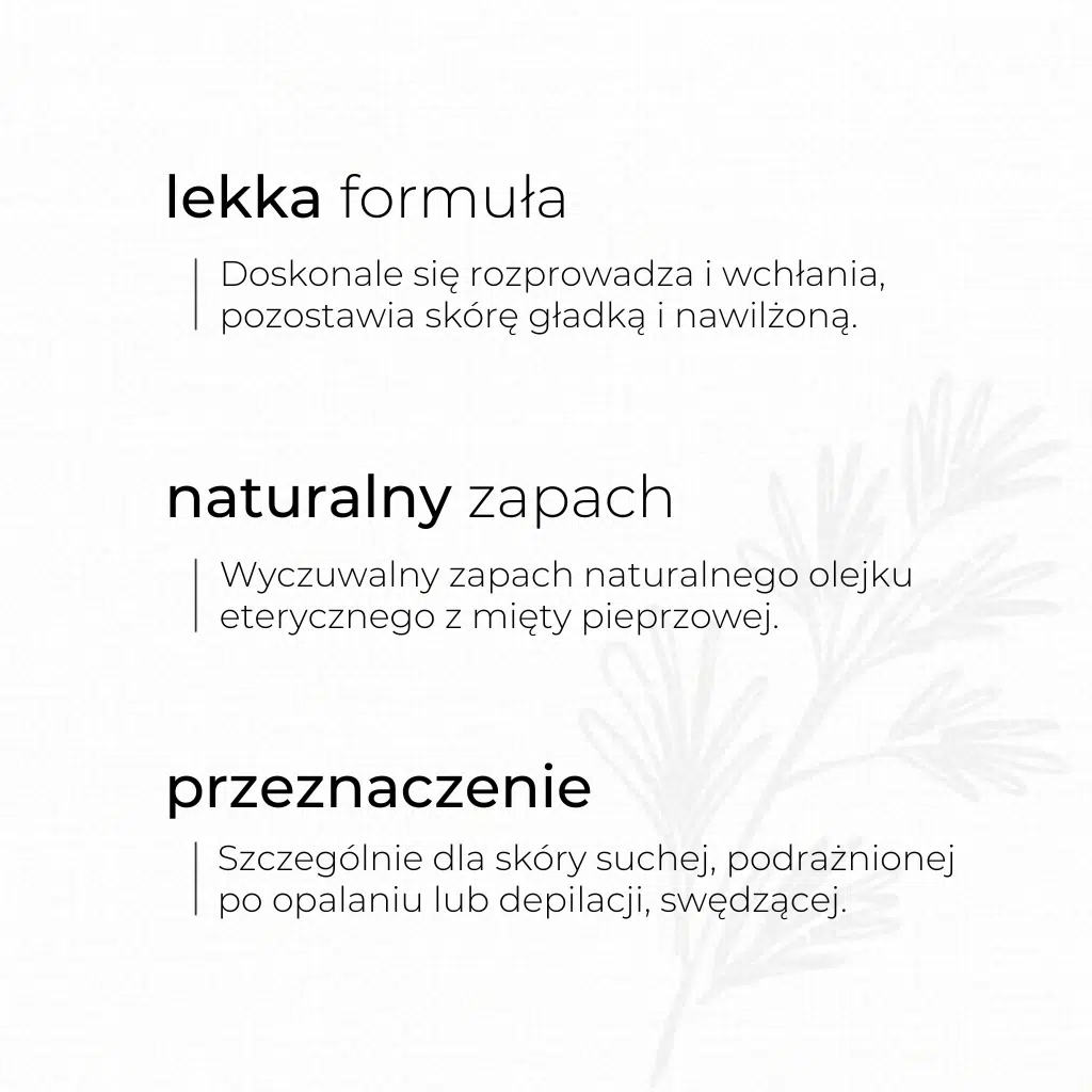 Aby nadać balsamowi jeszcze lepszych właściwości odświeżających, jego formuła została wzbogacona o olejek eteryczny z mięty pieprzowej. Dzięki temu balsam pozostawia na skórze delikatne uczucie chłodu, uspokaja i relaksuje.