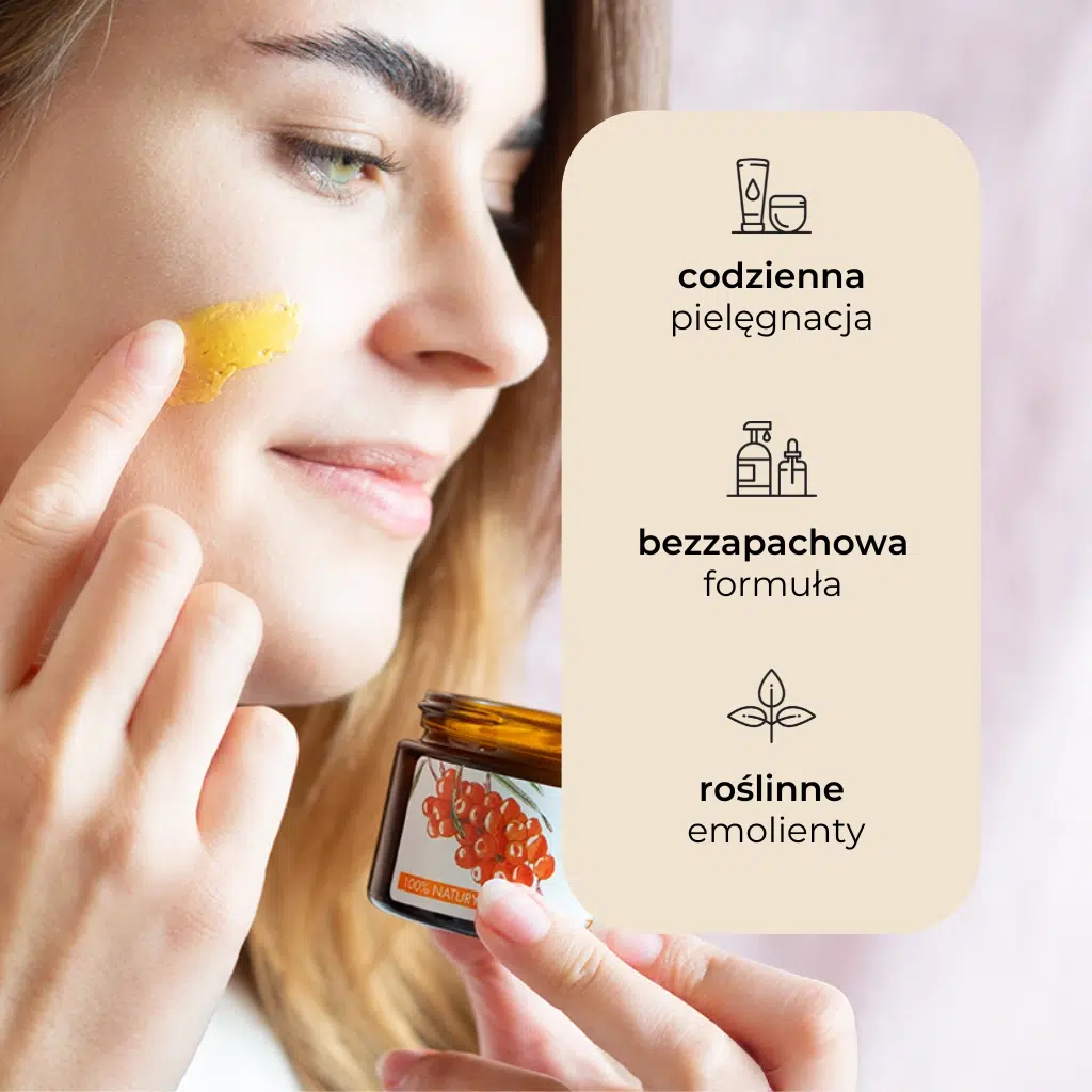 Olej rokitnikowy, który nadaje naszemu produktowi charakterystyczny kolor, to gwarancja intensywnego odżywienia i odnowy Twojej skóry. W połączeniu z olejem sojowym, jojoba, z pestek winogron oraz witaminą E stymulują procesy regeneracji i działają przeciwstarzeniowo. By zmniejszyć ryzyko alergii, krem nie posiada kompozycji zapachowej.