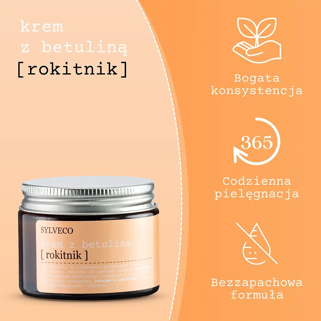 Naturalny krem brzozowo-rokitnikowy z betuliną nie zawiera konserwantów ani kompozycji zapachowych, dzięki czemu jest szczególnie polecany dla skóry wrażliwej i skłonnej do podrażnień. Główne substancje aktywne - [betulina i kwas betulinowy], uzyskiwane z kory brzozy - łagodzą i regenerują skórę. Krem został wzbogacony [olejem z rokitnika], zawierającym przeciwutleniacze: witaminę C i karotenoidy, które mają właściwości odżywcze, regenerujące i ochronne - wspomagają naturalną odnowę komórek.