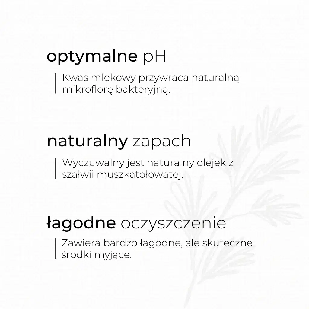 | Skład INCI | Aqua, Cocamidopropyl Betaine, Coco-glucoside, Glycerin, Glyceryl Oleate, Lactic Acid, Lauryl Glucoside, Panthenol, Plantago Lanceolata Leaf Extract, Quercus Robur Bark Extract, Salvia Sclarea Oil, Sodium Benzoate |