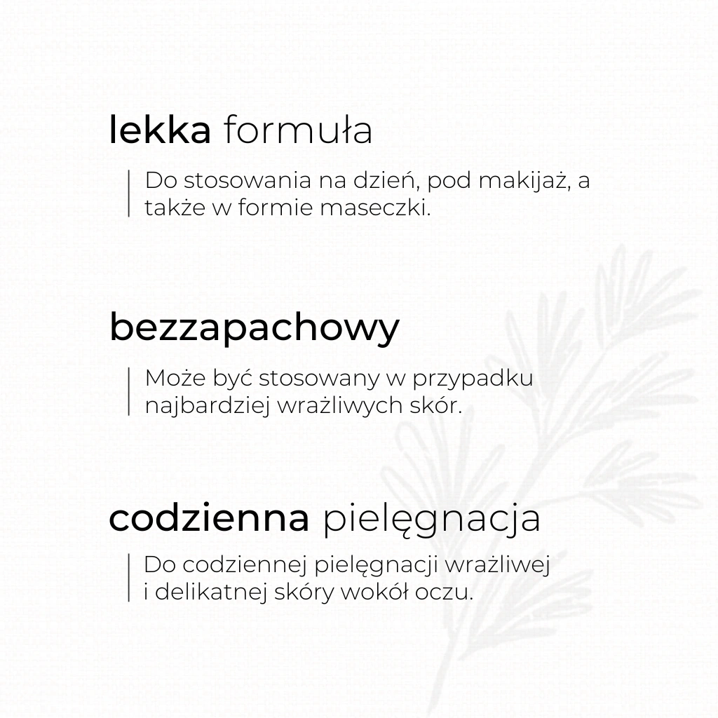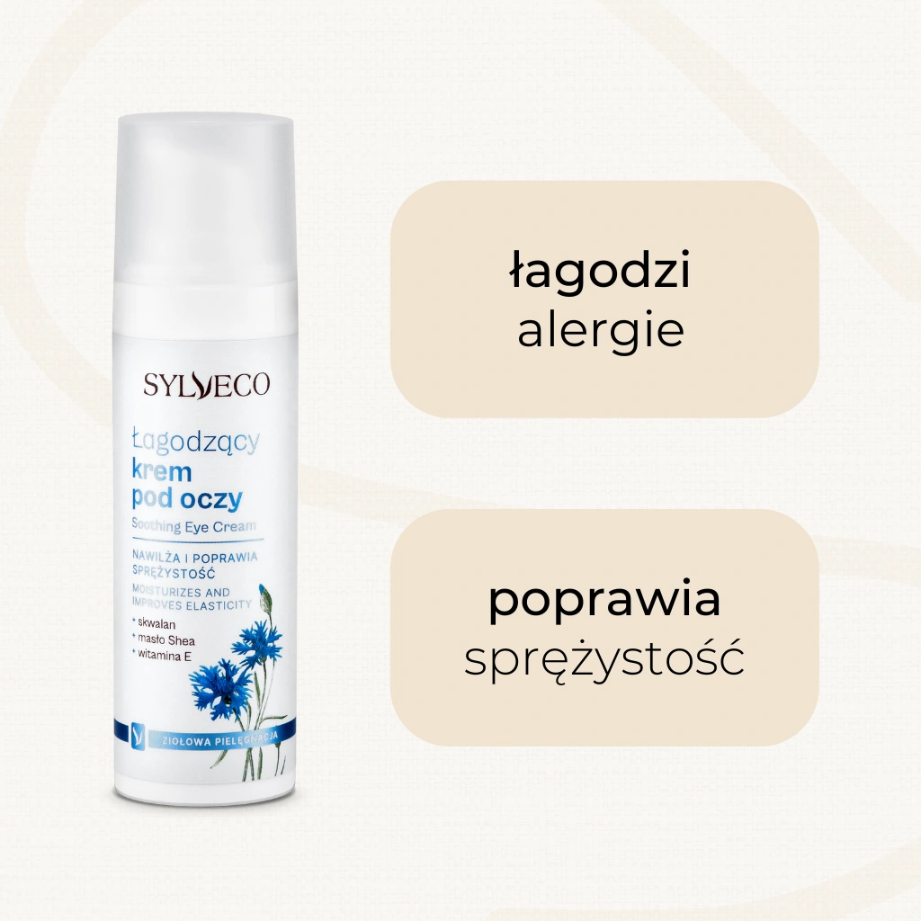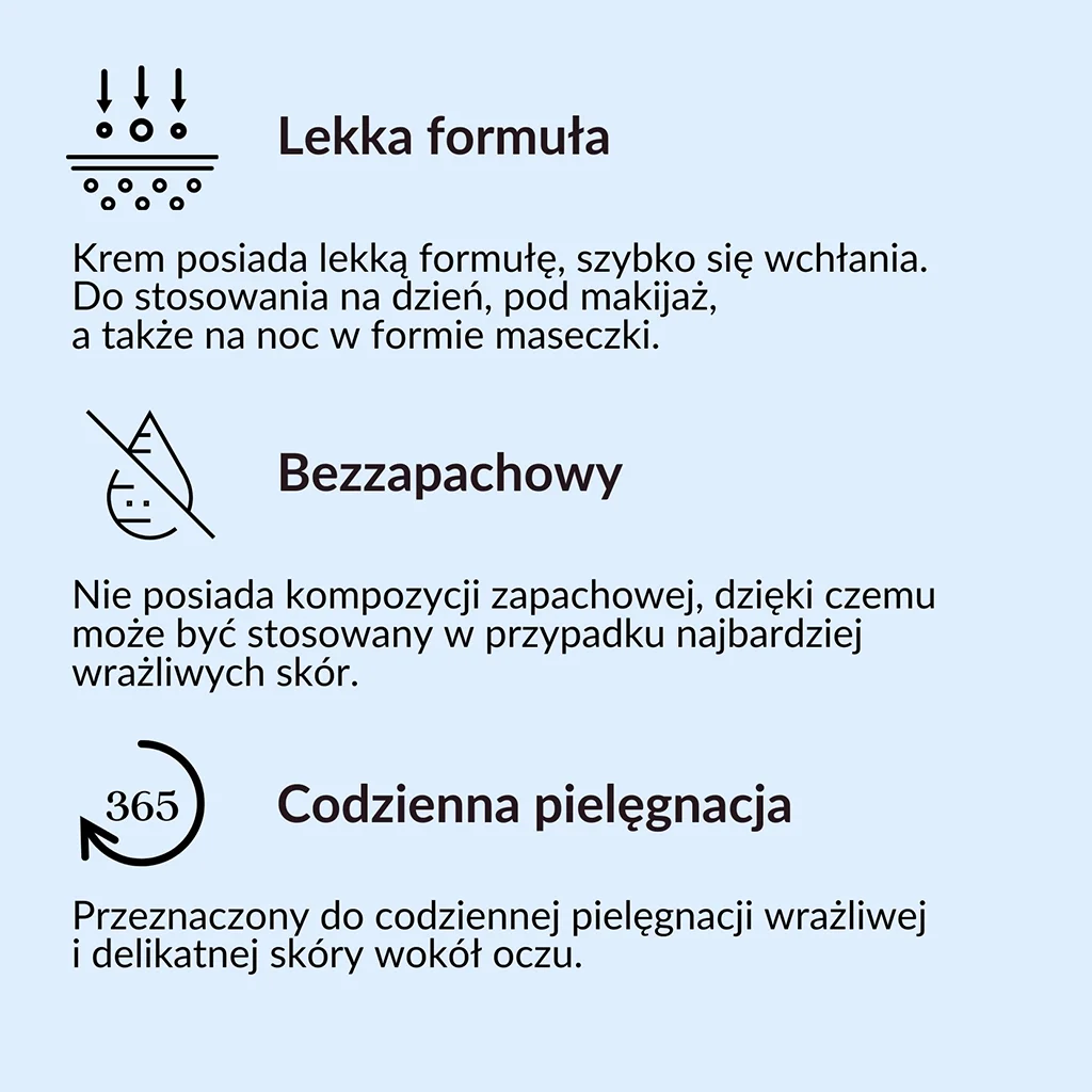 Naturalny, łagodzący krem pod oczy przeznaczony jest do codziennej pielęgnacji wrażliwej i delikatnej skóry wokół oczu. W jego składzie znalazły się ekstrakty z kory brzozy, chabru bławatka oraz świetlika, które działają łagodząco, kojąco i zmniejszają obrzęki. Dzięki specjalnie dobranej, bezzapachowej formule, krem poprawia strukturę skóry, przywracając jej właściwy poziom nawilżenia oraz sprężystość. Usuwa objawy zmęczenia i zaczerwienienia, hamuje procesy starzenia się skóry.