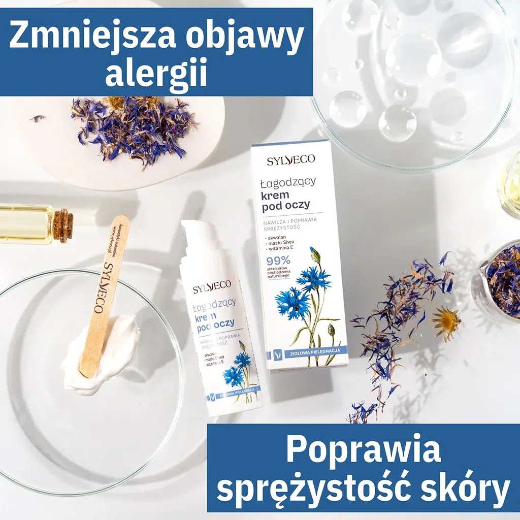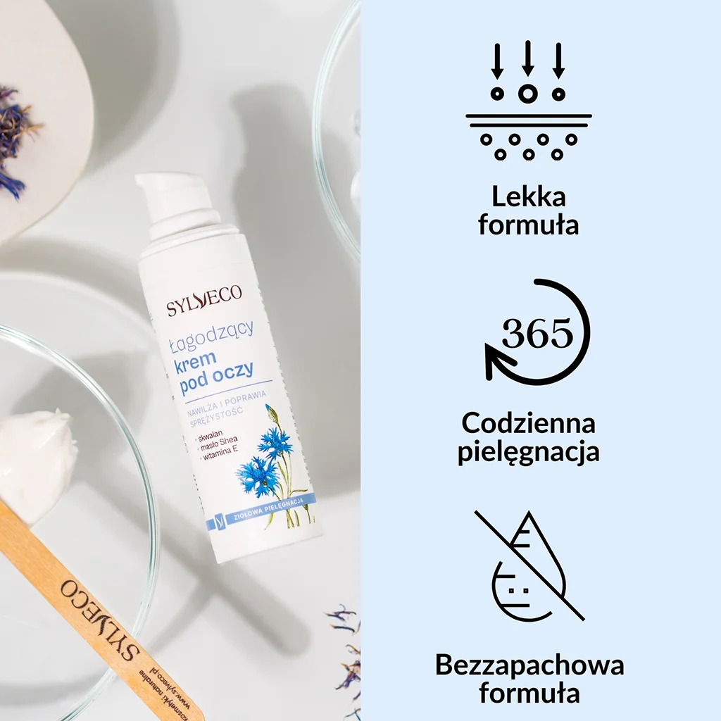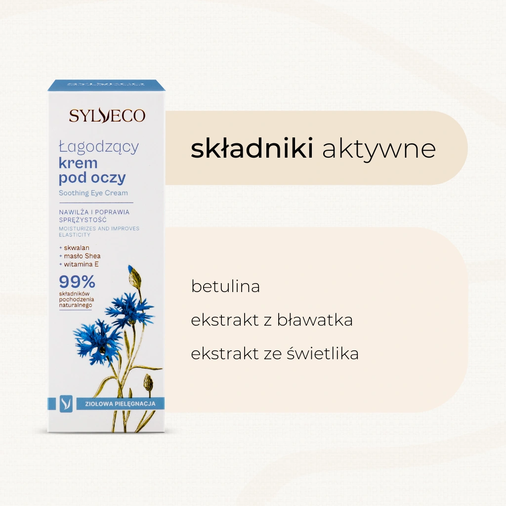 Naturalny, łagodzący krem pod oczy przeznaczony jest do codziennej pielęgnacji wrażliwej i delikatnej skóry wokół oczu. W jego składzie znalazły się ekstrakty z kory brzozy, chabru bławatka oraz świetlika, które działają łagodząco, kojąco i zmniejszają obrzęki. Dzięki specjalnie dobranej, bezzapachowej formule, krem poprawia strukturę skóry, przywracając jej właściwy poziom nawilżenia oraz sprężystość. Usuwa objawy zmęczenia i zaczerwienienia, hamuje procesy starzenia się skóry.