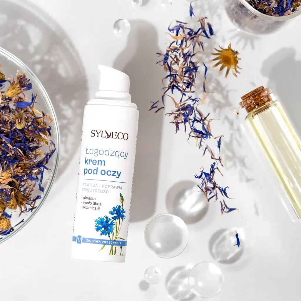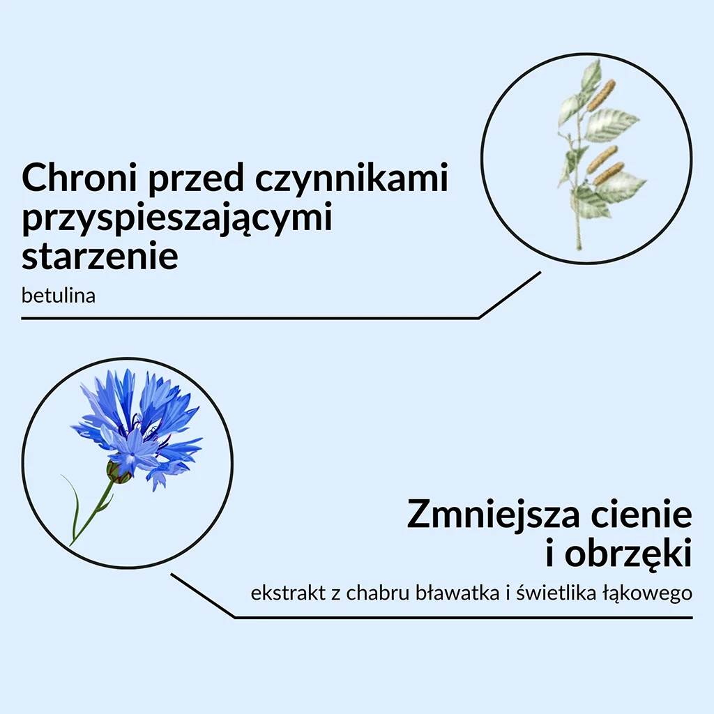 Chaber bławatek i świetlik łąkowy to znane w medycynie ludowej rośliny o dobroczynnym działaniu na oczy. Zawarte w naszym kremie zapewniają najdelikatniejszej i najcieńszej skórze wokół oczu długotrwałą ochronę i ukojenie. Starannie dobrane składniki aktywne kremu pozwolą zmniejszyć cienie i obrzęki, usunąć objawy zmęczenia, poprawiając jednocześnie sprężystość skóry.