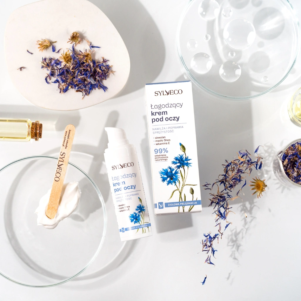 W skład kremu wchodzą ekstrakty z chabru bławatka i świetlika łąkowego, które słyną ze swoich właściwości redukujących cienie i obrzęki. Te składniki, w połączeniu z roślinnymi emolientami – olejem z pestek winogron, olejem sojowym, olejem arganowym oraz masłem Shea – znacznie zwiększają sprężystość skóry.
