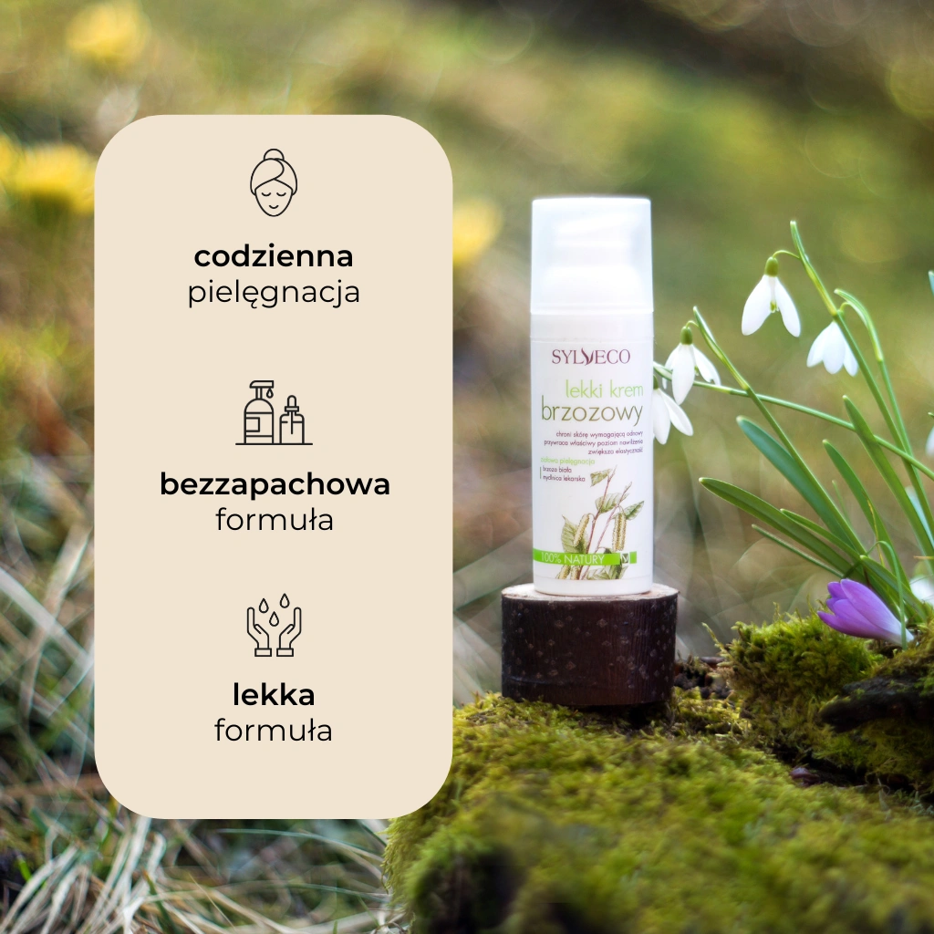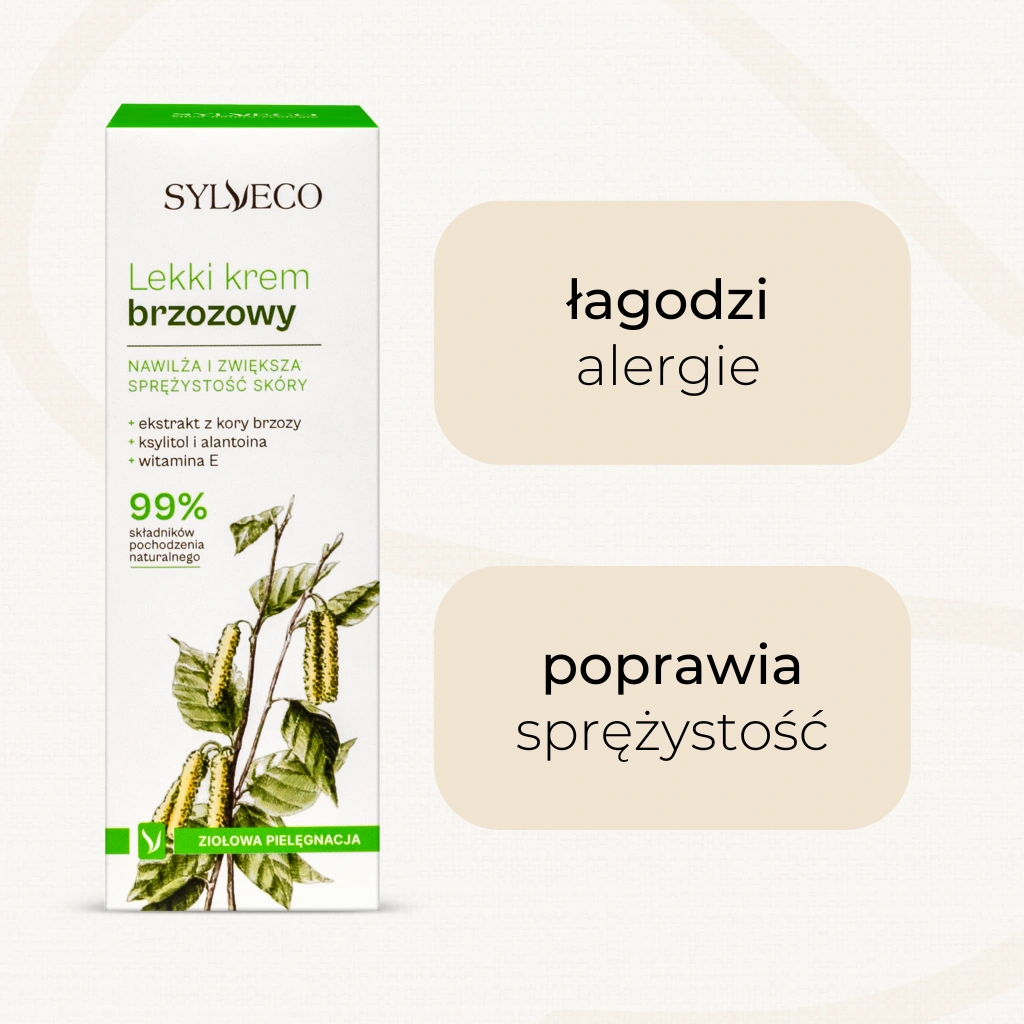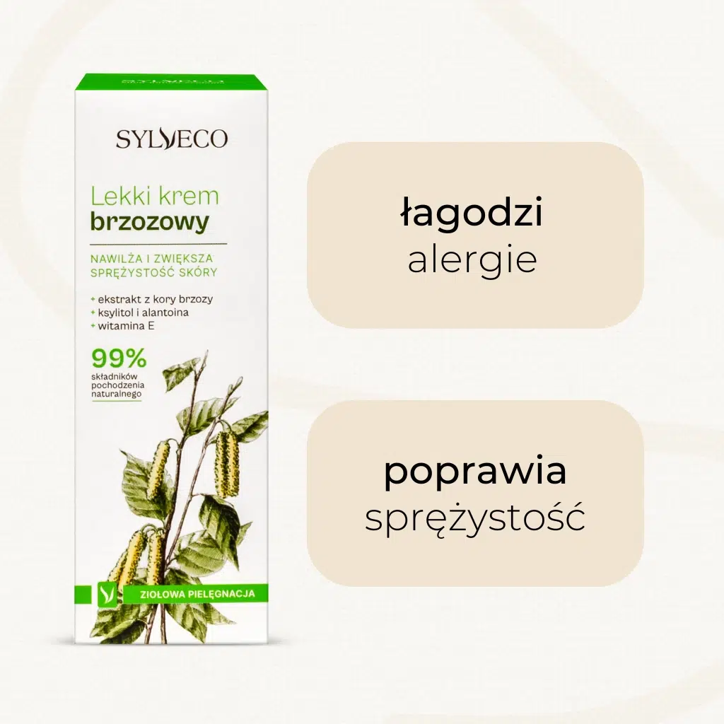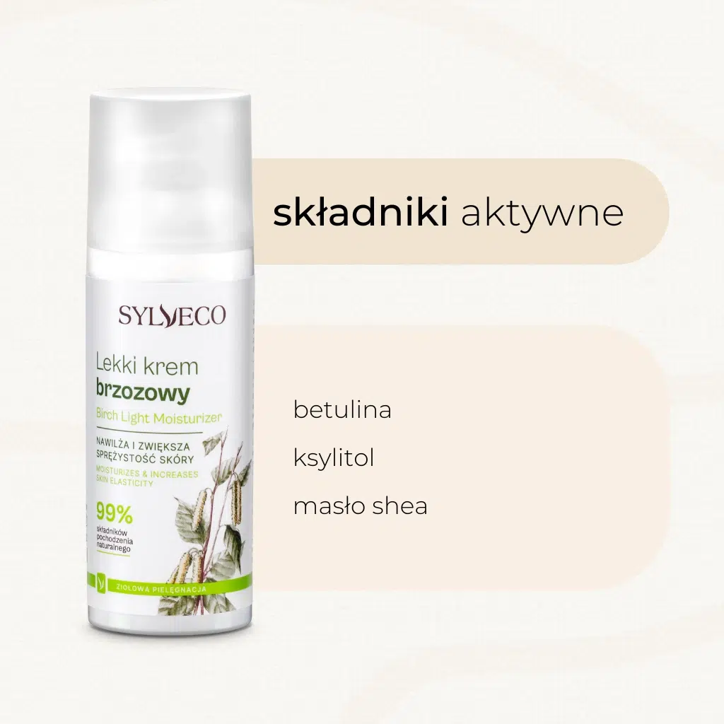 Naturalny lekki krem brzozowy jest przeznaczony do codziennej pielęgnacji każdego rodzaju cery wymagającej regeneracji. Zawiera ekstrakt z kory brzozy, który dzięki właściwości pobudzania syntezy kolagenu i elastyny, zwiększa sprężystość skóry i skutecznie opóźnia procesy starzenia. W kremie zastosowano połączenie ekstraktu z aloesu oraz ksylitol o działaniu wybitnie nawilżającym i zmiękczającym. Naturalne oleje roślinne i masło karite odbudowują warstwę wodno-lipidową i w połączeniu z alantoiną zapewniają skórze szybkie ukojenie. Dodatek witaminy E zabezpiecza ją przed negatywnym wpływem środowiska. Ekstrakt z mydlnicy lekarskiej, zawierający saponiny, ułatwia wnikanie składników aktywnych głębiej do skóry. Krem może być stosowany pod makijaż oraz na okolice przemęczonych oczu.